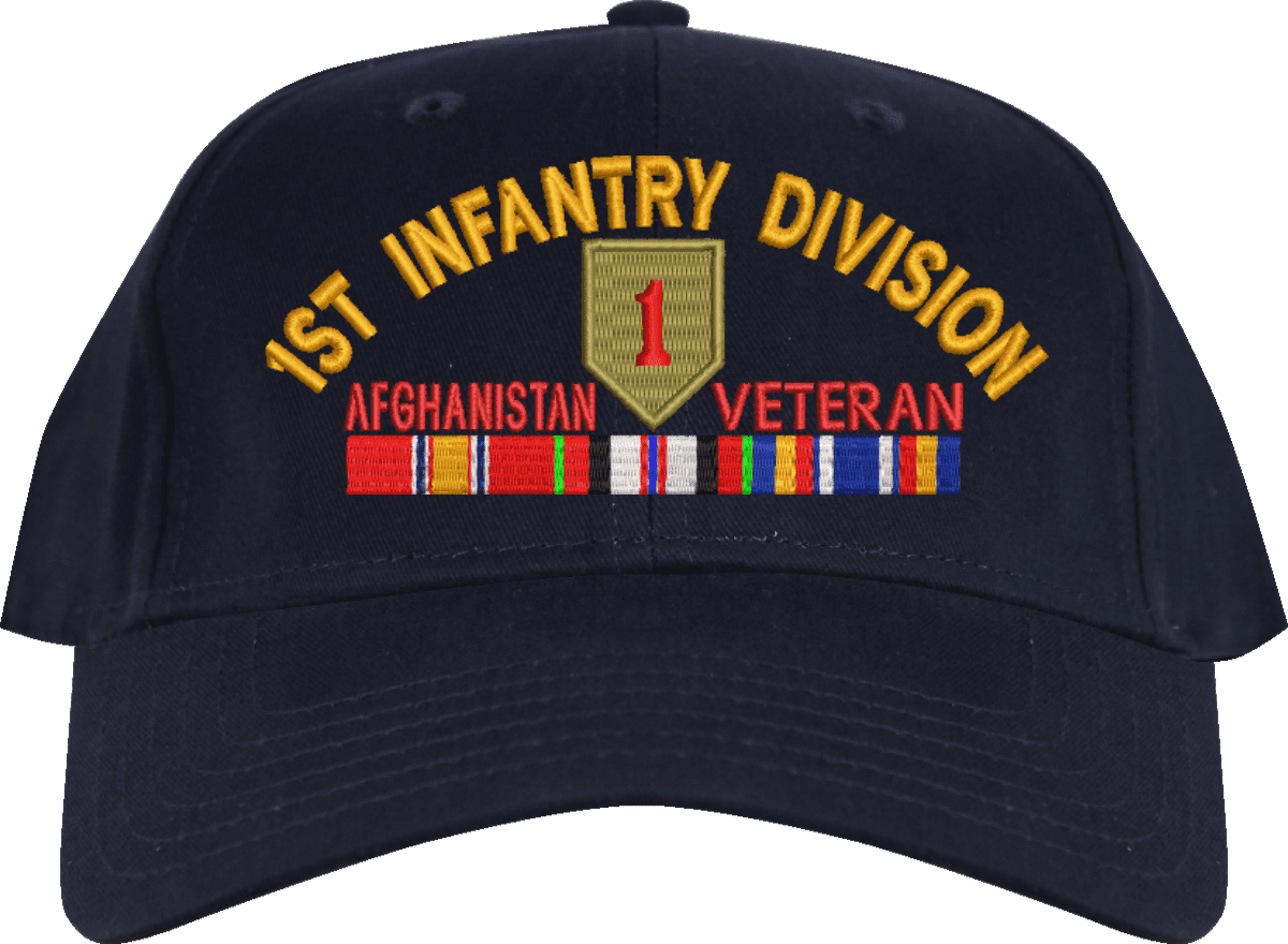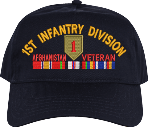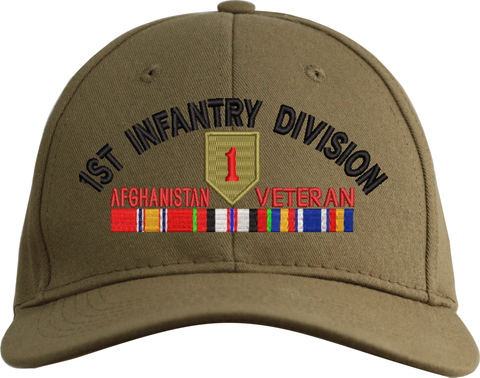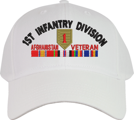 MilitaryBest is proud to offer this 1st Infantry Division Afghanistan Veteran Embroidered Cap with Ribbons. This cap is available in a 5 panel high profile or 6 panel low profile styling. All our caps are made from top quality materials. This cap would make a wonderful addition to your collection or a great gift! All custom embroidery is done at our facility in Scottsboro, AL.