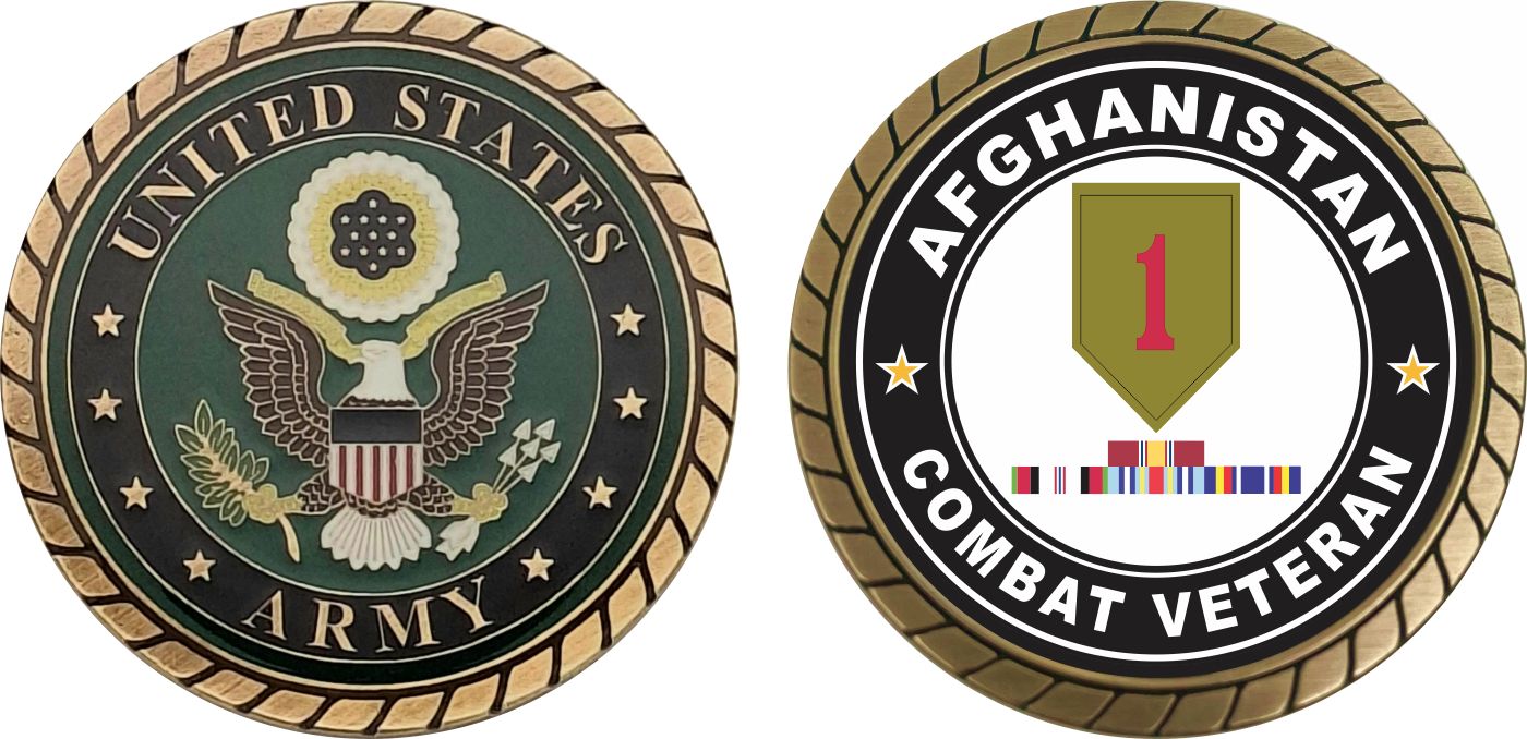 This 1 3/4” 1st Infantry Division Afghanistan with GWOT Ribbons Combat Veteran Challenge Coin is proudly offered by MilitaryBest. This Officially Licensed Army coin has beautiful enamel finish on one side and an organized crisp clean 1st Infantry Division Afghanistan with GWOT Ribbons Combat Veteran design on the opposite side.