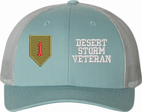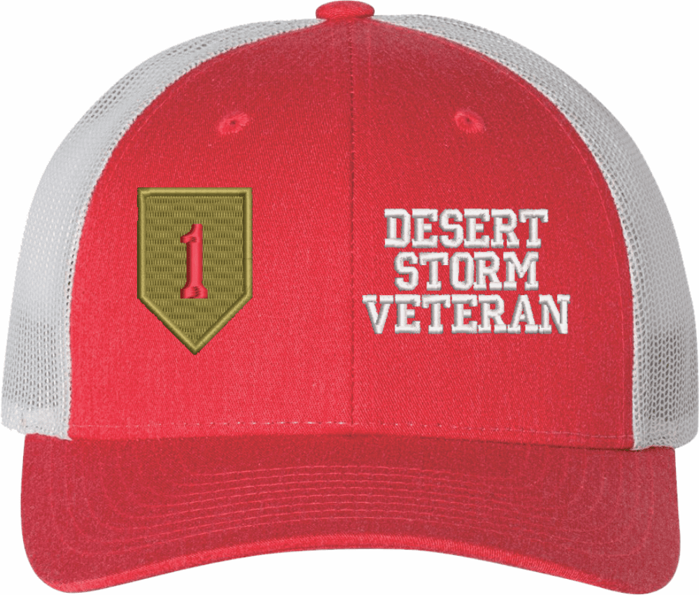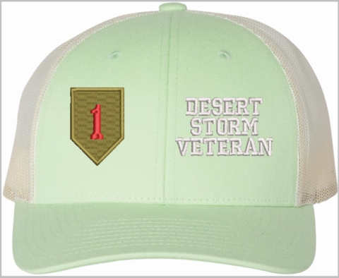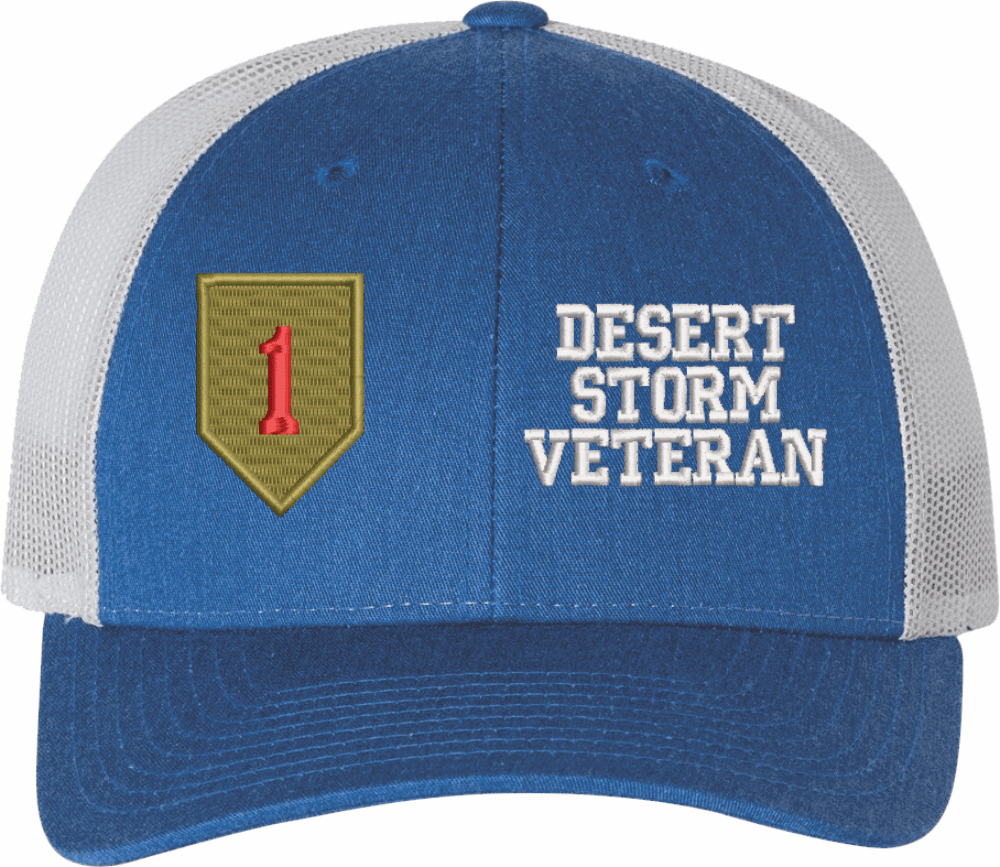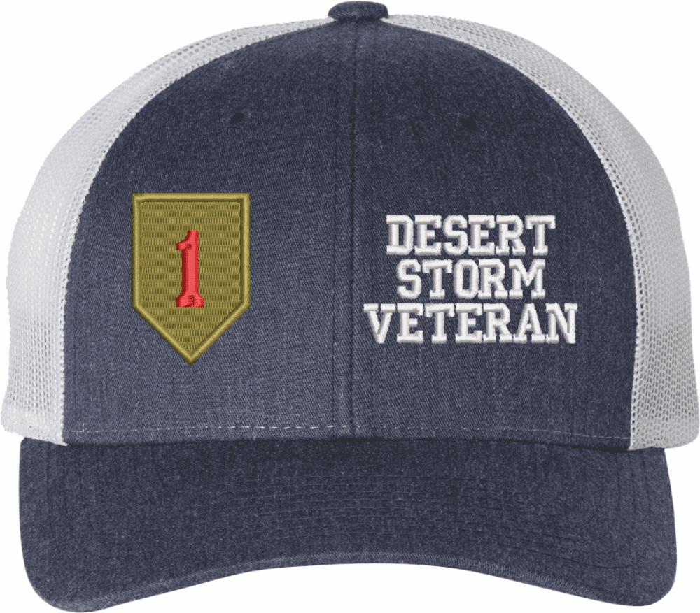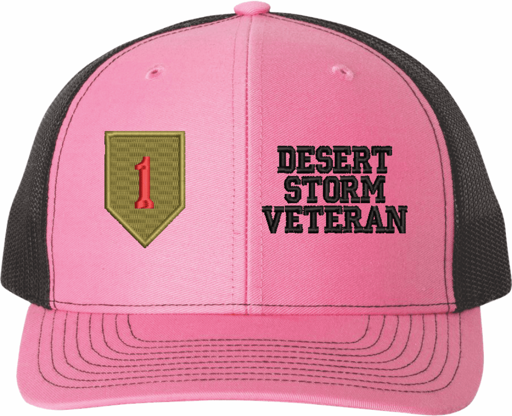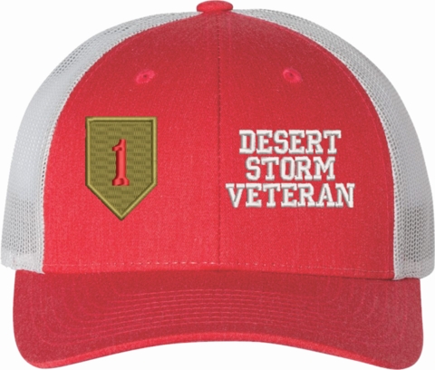 MilitaryBest is proud to offer this Mesh Back U.S. Army 1st Infantry Division Desert Storm Veteran Women's Split-Cap. The design is embroidered onto a 6x panel mid/low profile mesh back cap and is crisp, clean, and sure to be loved by all! As with all MilitaryBest caps and apparel your satisfaction is guaranteed!Caps ordered with embroidered back text requires an additional 1 to 2 days of production time. All personalized caps will be embroidered in ALL CAPITAL LETTERS. Caps personalized with back text are not returnable unless there is a material defect in the cap.