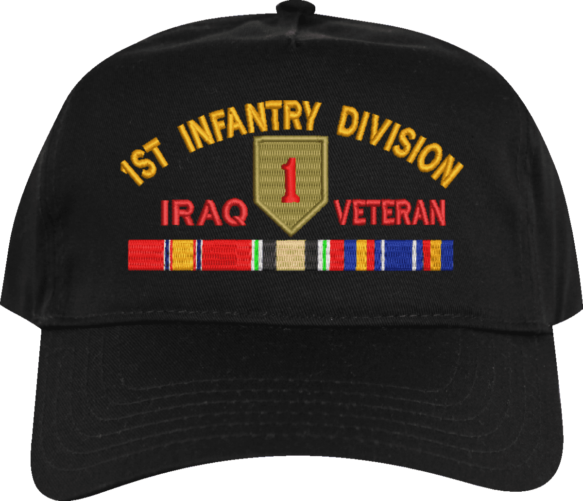 MilitaryBest is proud to offer this 1st Infantry Division Iraq Veteran Embroidered Cap with Ribbons. This cap is available in a 5 panel high profile or 6 panel low profile styling. All our caps are made from top quality materials. This cap would make a wonderful addition to your collection or a great gift! All custom embroidery is done at our facility in Scottsboro, AL.