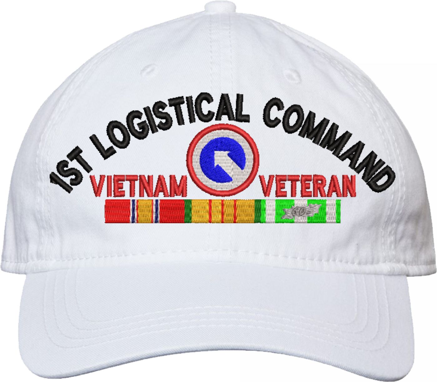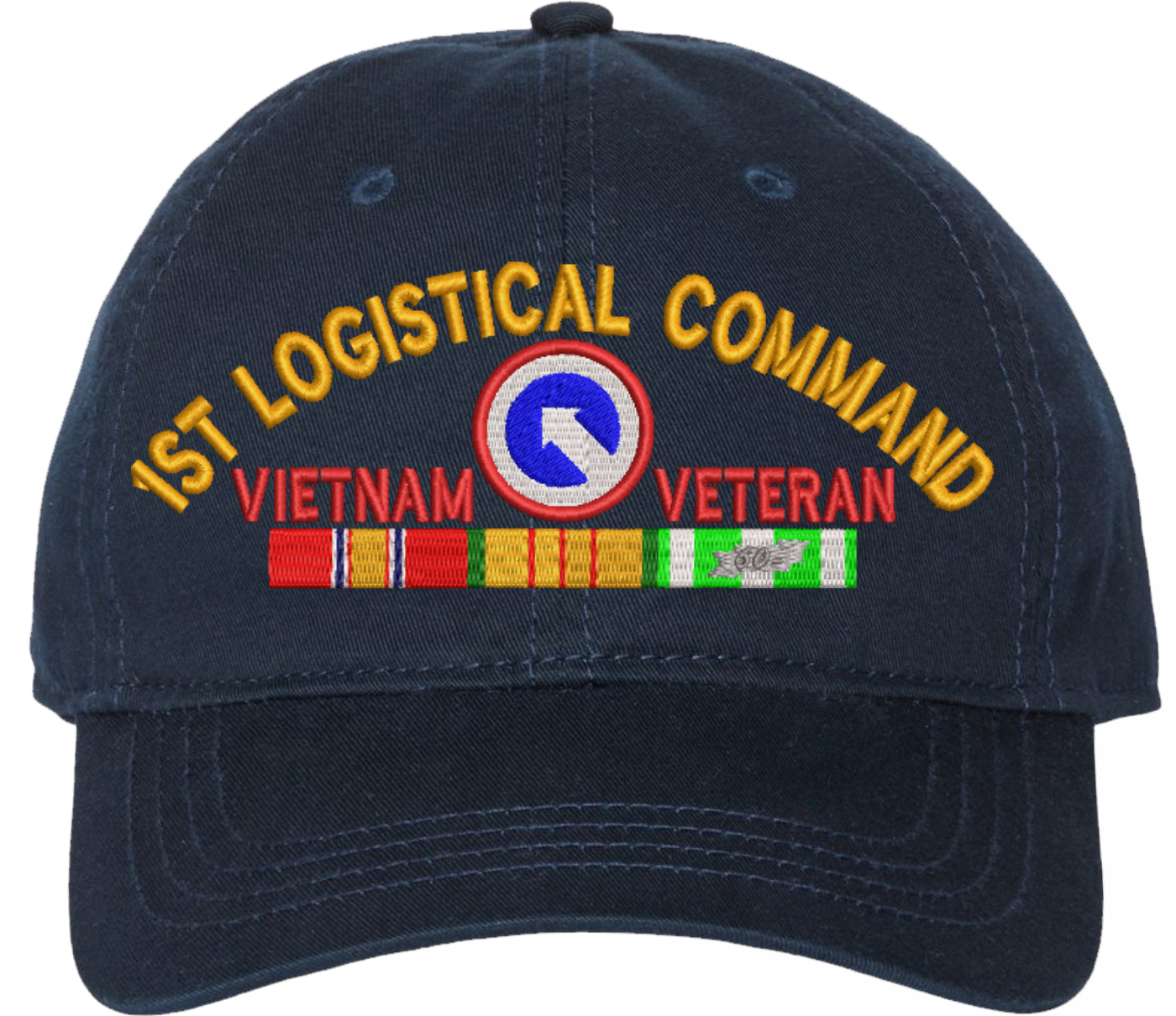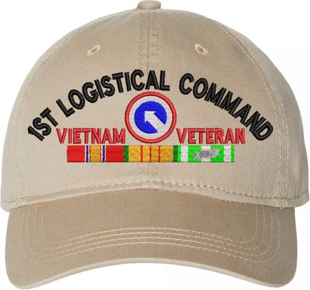 Show your Army pride with this 1st Logistical Command Vietnam Veteran with Ribbons Unstructured Dad Cap from MilitaryBest. Crafted from 100% washed chino twill cotton, this six-panel, low-profile cap offers a relaxed and comfortable fit. Featuring high-quality embroidery done in our Scottsboro, Alabama facility, this cap is designed with a pre-curved visor and an adjustable tri-glide buckle closure for a perfect fit. Whether for everyday wear or as a meaningful gift, this cap is a great way to honor your own or a loved one's service.For caps ordered with custom embroidered personalized text please allow an additional 3 to 5 days production time. All custom back text will be embroidered in ALL CAPITAL LETTERS. Caps with back text or eggs are non-returnable unless there is a material defect in the cap.