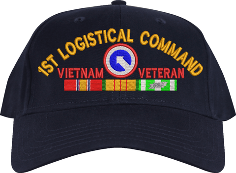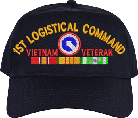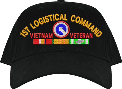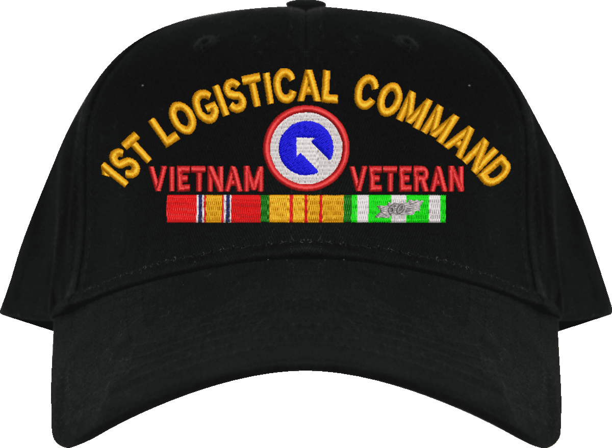 MilitaryBest is proud to offer this 1st Logistical Command Vietnam Veteran Embroidered Cap with Ribbons. This cap is available in a 5 panel high profile or 6 panel low profile styling. All our caps are made from top quality materials. This cap would make a wonderful addition to your collection or a great gift! All custom embroidery is done at our facility in Scottsboro, AL.