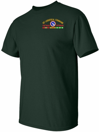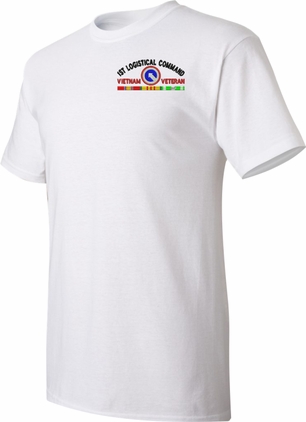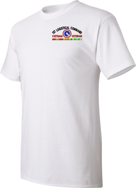 Note: Some of the Color Options pictured may not be available. Available Color Options are listed on the drop down menu above. Yellow colored text is embroidered in black on Khaki Tan and White shirts.MilitaryBest is proud to offer this 1st Logistical Command Vietnam Veteran with Ribbons Embroidered T-Shirt. These quality Military T-Shirts are proudly embroidered at our facilities in Scottsboro, AL. Support the Army MWR program by purchasing only from Licensed Vendors. To all of our Vietnam Veterans, Welcome Home!