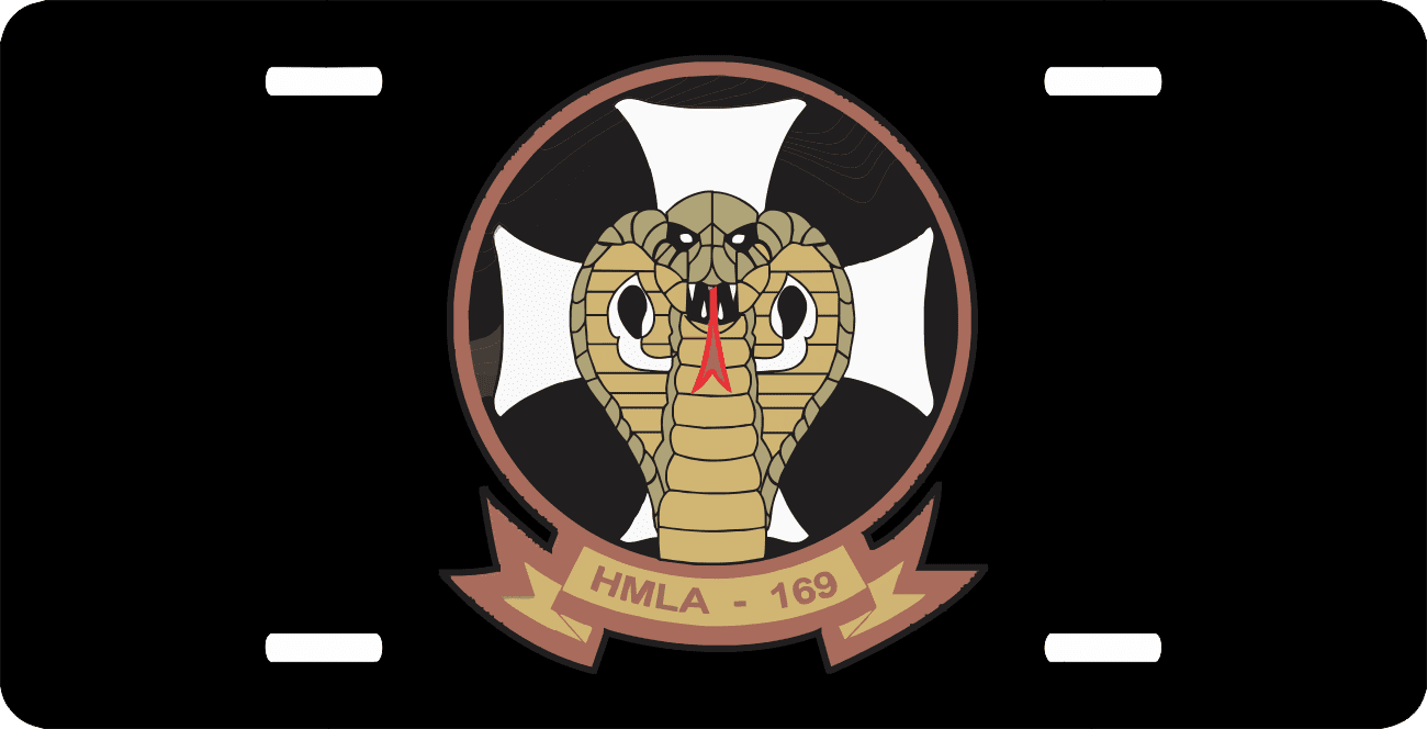 This 1st Marine Division Marine Light Attack Helicopter Squadron 169 License Plate is made from heavy gauge aluminum and has a baked enamel finish to last for many years of use. Each plate measures 5 15/16" x 11 15/16". This license plate would make a wonderful addition to your collection or a great gift.