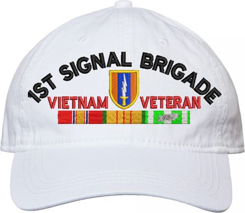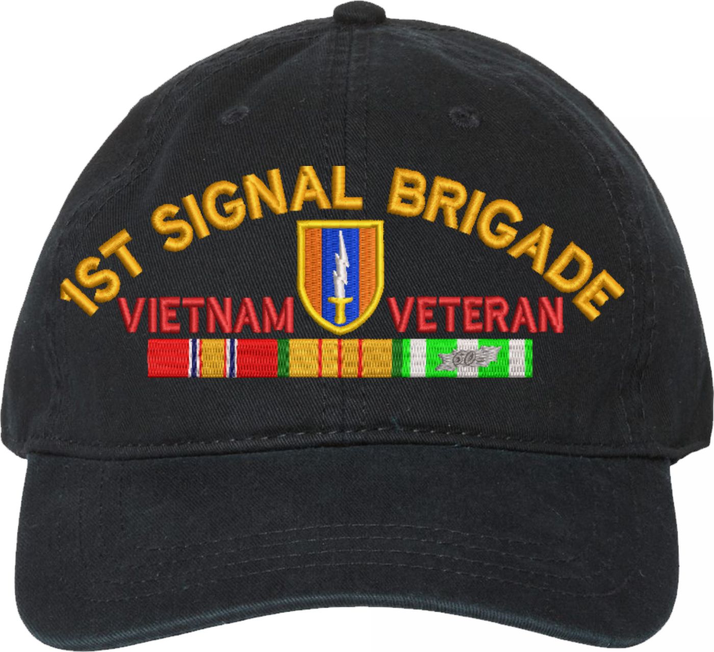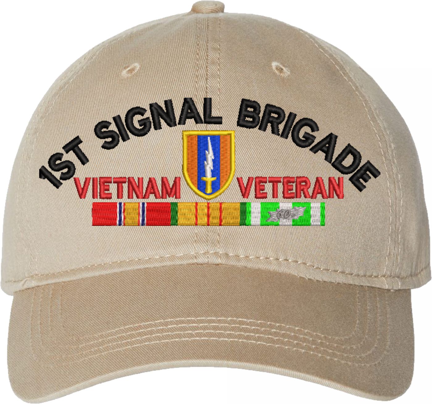 Show your Army pride with this 1st Signal Brigade Vietnam Veteran with Ribbons Unstructured Dad Cap from MilitaryBest. Crafted from 100% washed chino twill cotton, this six-panel, low-profile cap offers a relaxed and comfortable fit. Featuring high-quality embroidery done in our Scottsboro, Alabama facility, this cap is designed with a pre-curved visor and an adjustable tri-glide buckle closure for a perfect fit. Whether for everyday wear or as a meaningful gift, this cap is a great way to honor your own or a loved one's service.For caps ordered with custom embroidered personalized text please allow an additional 3 to 5 days production time. All custom back text will be embroidered in ALL CAPITAL LETTERS. Caps with back text or eggs are non-returnable unless there is a material defect in the cap.