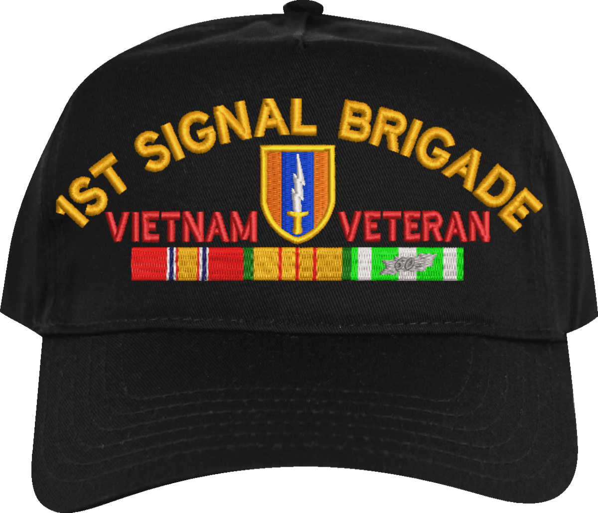 MilitaryBest is proud to offer this 1st Signal Brigade Vietnam Veteran Embroidered Cap with Ribbons. This cap is available in a 5 panel high profile or 6 panel low profile styling. All our caps are made from top quality materials. This cap would make a wonderful addition to your collection or a great gift! All custom embroidery is done at our facility in Scottsboro, AL.