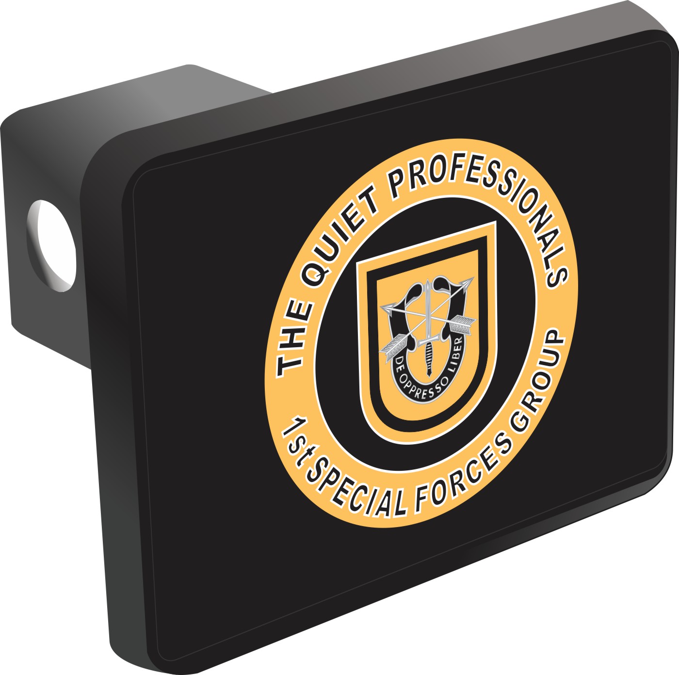 This 1st Special Forces Quiet Professionals Hitch Cover is proudly Made in the USA. Each Hitch Cover's face plate measures 4.7" x 3.4" and is applied on a black heavy duty injection molded plastic 2" hitch cover; link pin not included. The face plate of the hitch cover is sublimation printed to provide a beautiful glossy finish sure to catch the eye. This hitch cover would make a wonderful addition to your truck or other vehicle.A percentage of the sale of each MilitaryBest item is forwarded to the licensing departments of each respective branch of service in support of the MWR (Morale, Welfare, & Recreation) program. These payments are made by either ALL4U LLC or the wholesaler from where the item originated. Our team thanks you for your service and your support of these programs.