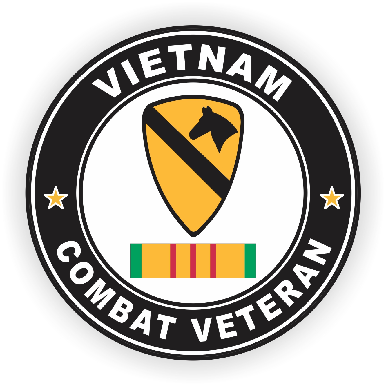 This Vinyl 1st Cavalry Division Vietnam Combat Veteran with Ribbon sticker is a Militarybest.com exclusive. Our combat veteran decal is make at our facilities in Scottsboro, Alabama. This sticker measures on its longest side and it is designed for outside application. For bulk pricing for custom and wholesale decals click here: Custom & Wholesale Decals!*While many of our customers use our decals on a variety of surfaces. Their intended purpose is for windshield applications