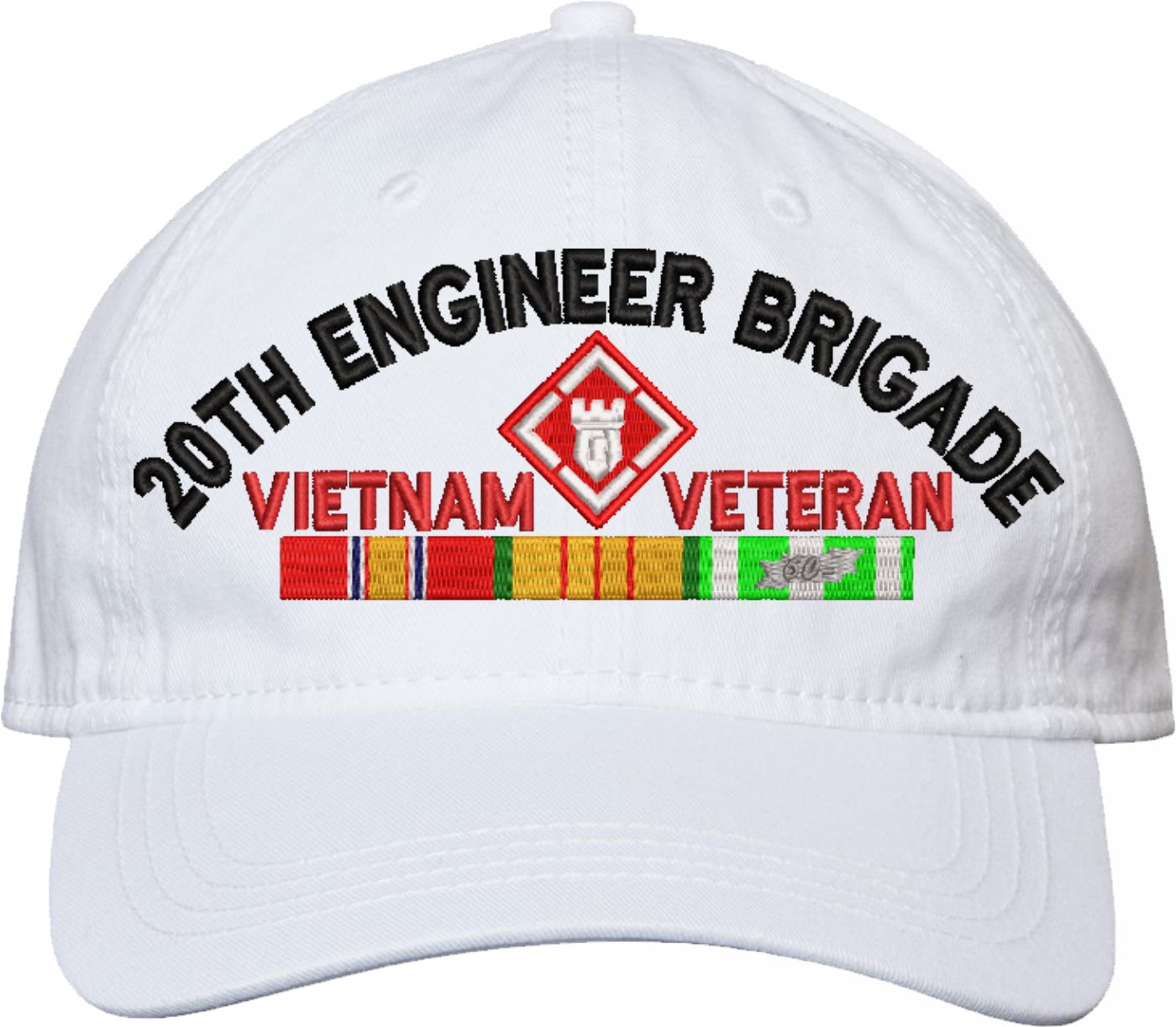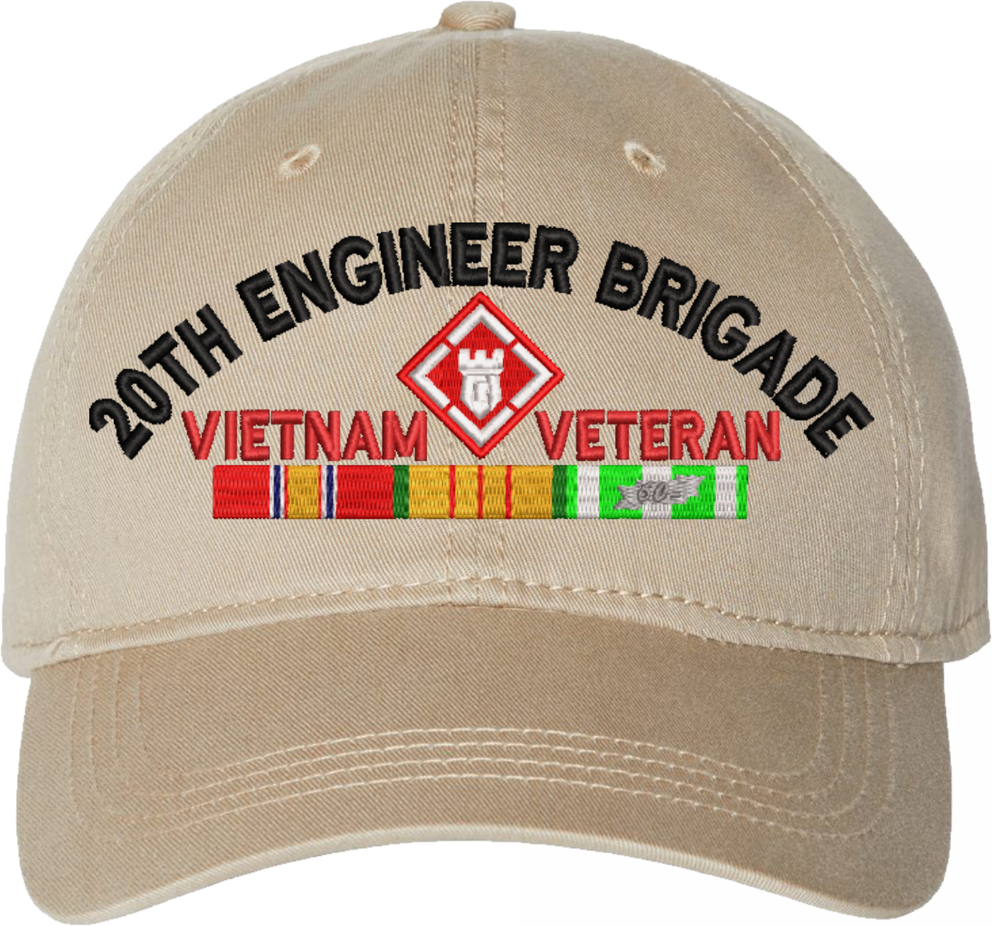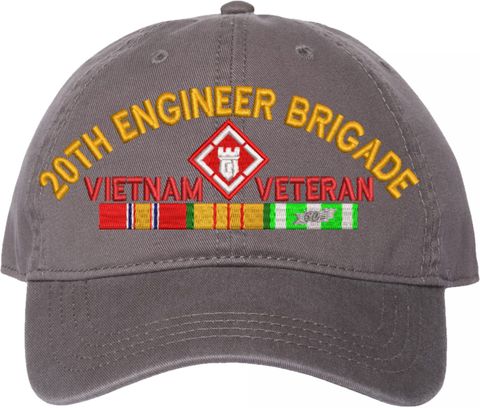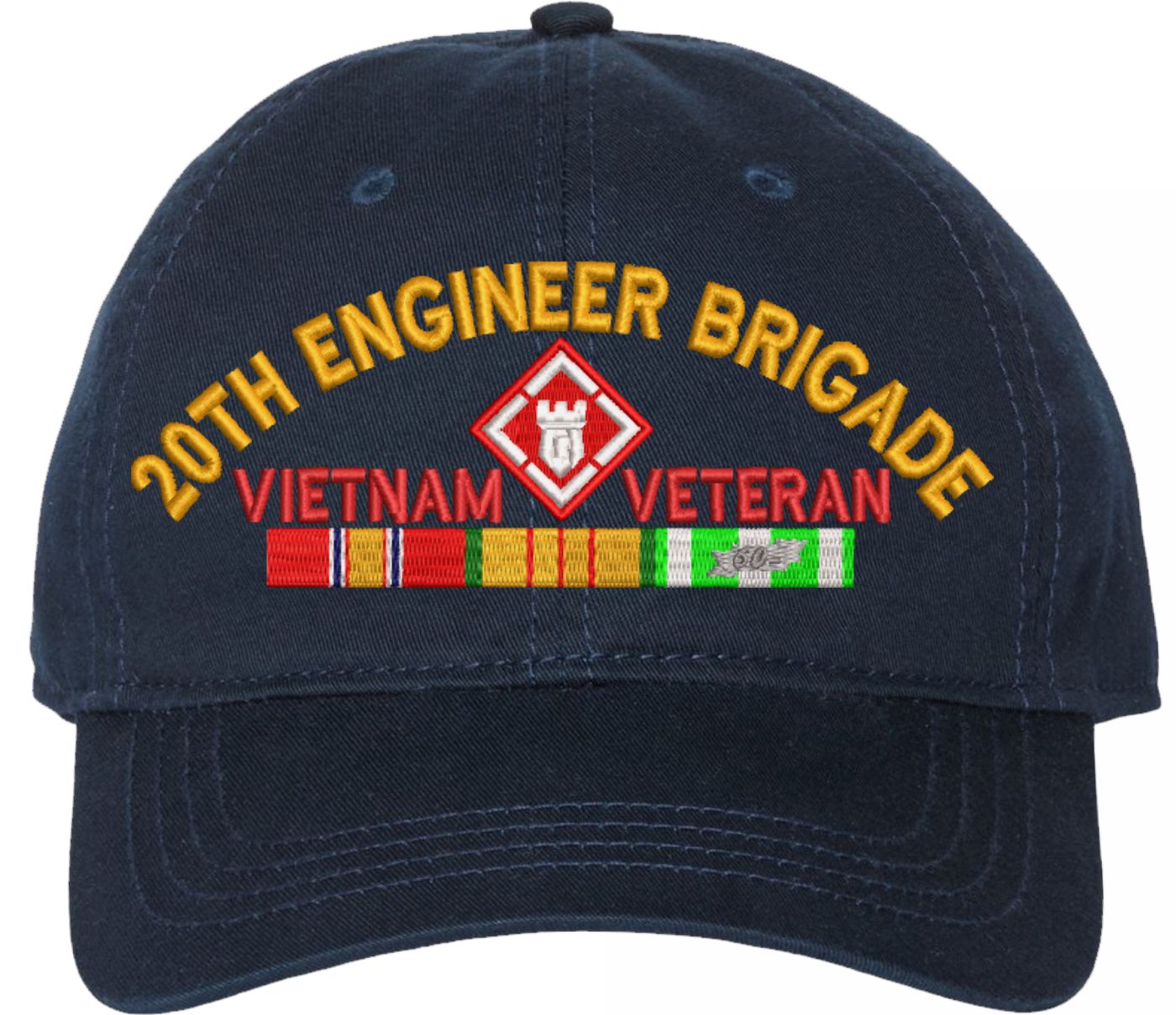 Show your Army pride with this 20th Engineer Brigade Vietnam Veteran with Ribbons Unstructured Dad Cap from MilitaryBest. Crafted from 100% washed chino twill cotton, this six-panel, low-profile cap offers a relaxed and comfortable fit. Featuring high-quality embroidery done in our Scottsboro, Alabama facility, this cap is designed with a pre-curved visor and an adjustable tri-glide buckle closure for a perfect fit. Whether for everyday wear or as a meaningful gift, this cap is a great way to honor your own or a loved one's service.For caps ordered with custom embroidered personalized text please allow an additional 3 to 5 days production time. All custom back text will be embroidered in ALL CAPITAL LETTERS. Caps with back text or eggs are non-returnable unless there is a material defect in the cap.