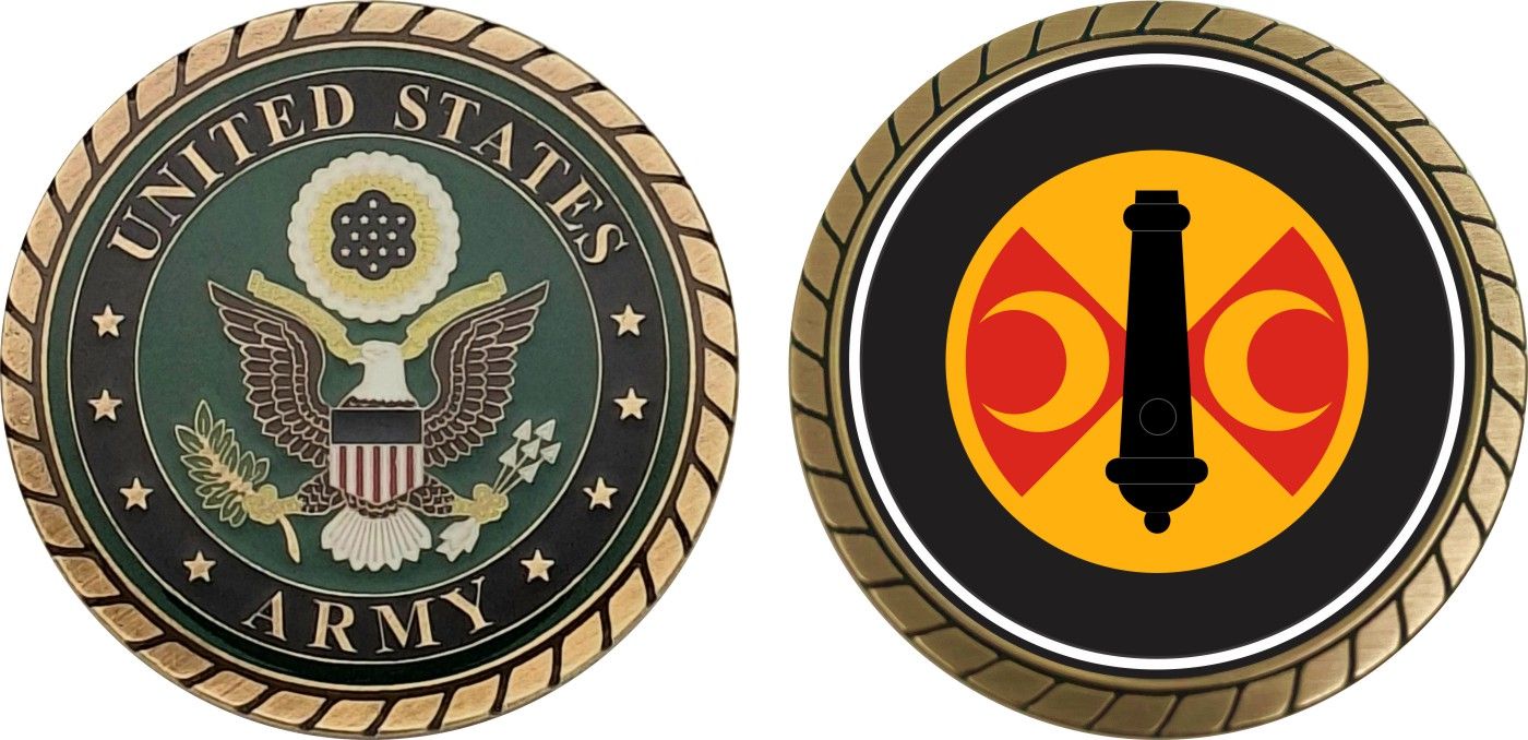 This 1 3/4” 210th Field Artillery Brigade Patch Challenge Coin is proudly offered by Militarybest. This Officially Licensed Army coin has beautiful enamel finish on one side and an organized crisp clean design on the opposite side.
