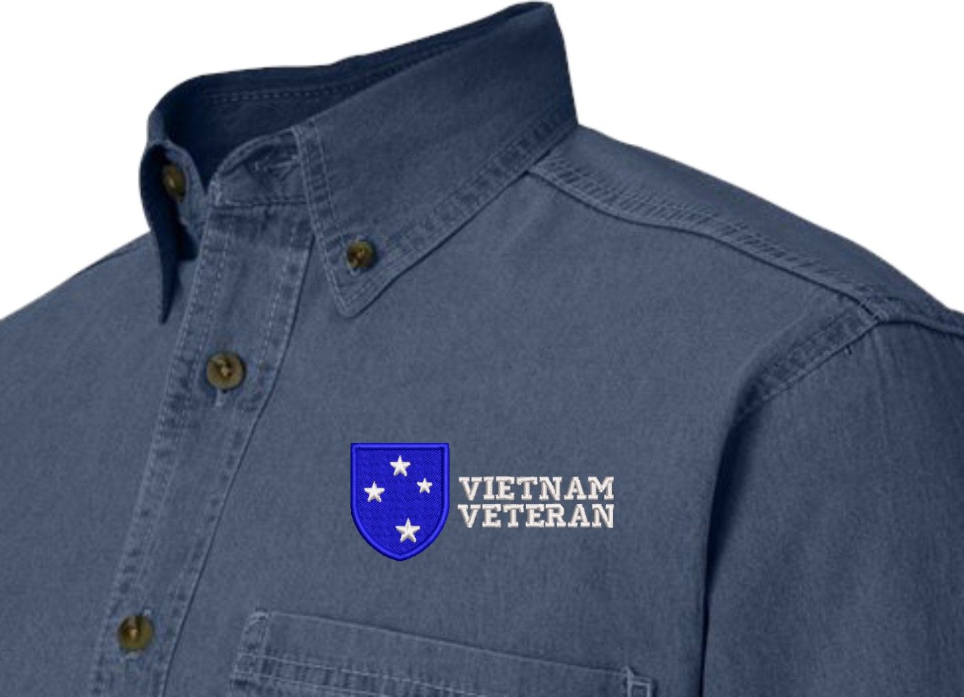 Note: Some of the Color Options pictured may not be available. Available Color Options are listed on the drop down menu above.MilitaryBest is proud to offer this quality 23rd Infantry Division Vietnam Veteran Denim Shirt. This long sleeve button down denim shirt is made using a 100% cotton denim material. These quality Military Denim Shirts are proudly embroidered at our facilities in Scottsboro, AL. Support the Army MWR program by purchasing only from Licensed Vendors.