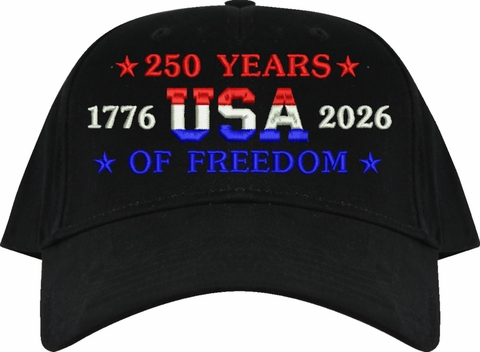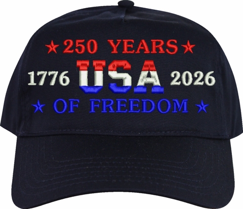Celebrate 250 years of the United States of America! MilitaryBest is proud to offer this quality 250 Years of Freedom Embroidered Cap. This cap is available in either 5 panel high profile or 6 panel low profile styling. This cap will make a great addition to your collection or a great gift. This cap is crafted by our skilled embroidery technicians at our facilities in Scottsboro, AL. Your satisfaction is guaranteed!For caps ordered with custom embroidered personalized text please allow an additional 3 to 5 days production time. All custom text will be embroidered in ALL CAPS. Caps with custom text or eggs are non-returnable unless there is a material defect in the cap.