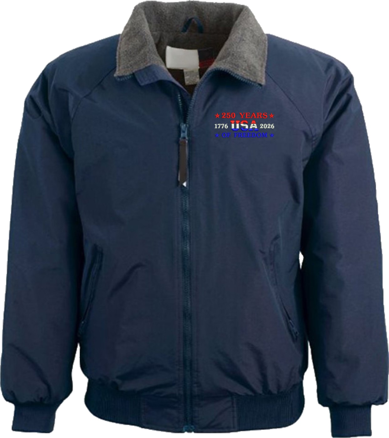 *** The brand of Jacket will vary, and may not match the brand pictured above. ***MilitaryBest is proud to offer this quality 250 Years of Freedom Embroidered Jacket. Each 3 season jacket is made from a 3-Layer system consisting of a nylon shell, an insulator layer, Nylon-lined sleeves, and an inside layer of fleece for comfort. Each jacket’s features include a sturdy black enamel front-zipper, raglan sleeves, outsize zip pockets, an inside zip security pocket, YKK zippers, and a banded-bottom. As with all MilitaryBest products, your satisfaction is guaranteed! This jacket can be worn in fall, winter, and spring and is proudly custom embroidered at our facilities in Scottsboro, AL.