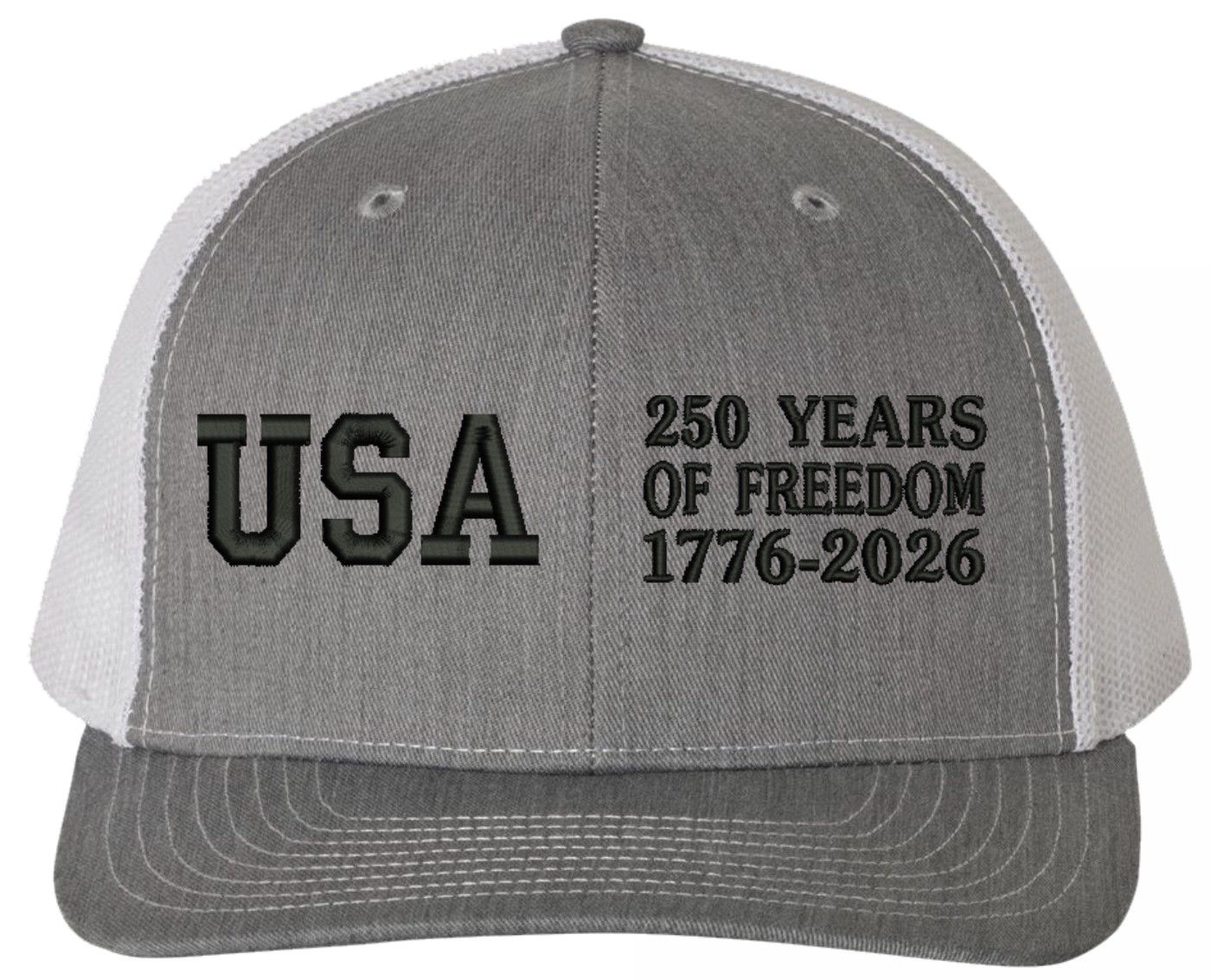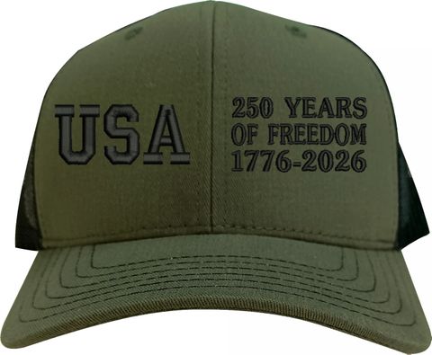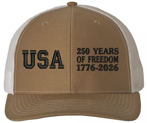 Celebrate 250 Years of the United States of America! MilitaryBest is proud to offer this 250 Years of Freedom (Split) Embroidered Mesh-Back Cap. This Mesh-Back Cap is expertly crafted by our skilled embroidery technicians at our facilities in Scottsboro, Alabama. As with all MilitaryBest items, your satisfaction is guaranteed!For caps ordered with custom embroidered personalized text please allow an additional 3 to 5 days production time. All custom back text will be embroidered in ALL CAPITAL LETTERS. Caps with back text or eggs are non-returnable unless there is a material defect in the cap.