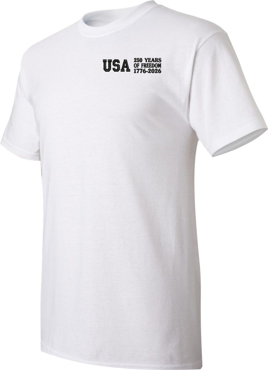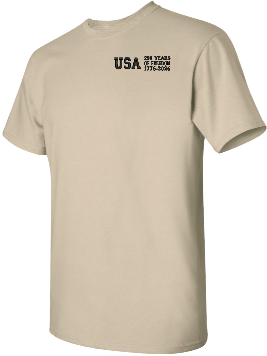 Note: Some of the Color Options pictured may not be available. Available Color Options are listed on the drop down menu above.MilitaryBest is expanding its line of apparel with this fine 250 Years of Freedom (Split) Embroidered T-Shirt. This short sleeve t-shirt is made using 100% cotton material. This shirt will make an excellent addition to your wardrobe or a fine gift. This Product is custom embroidered at our facilities in Scottsboro, AL when you place your order.