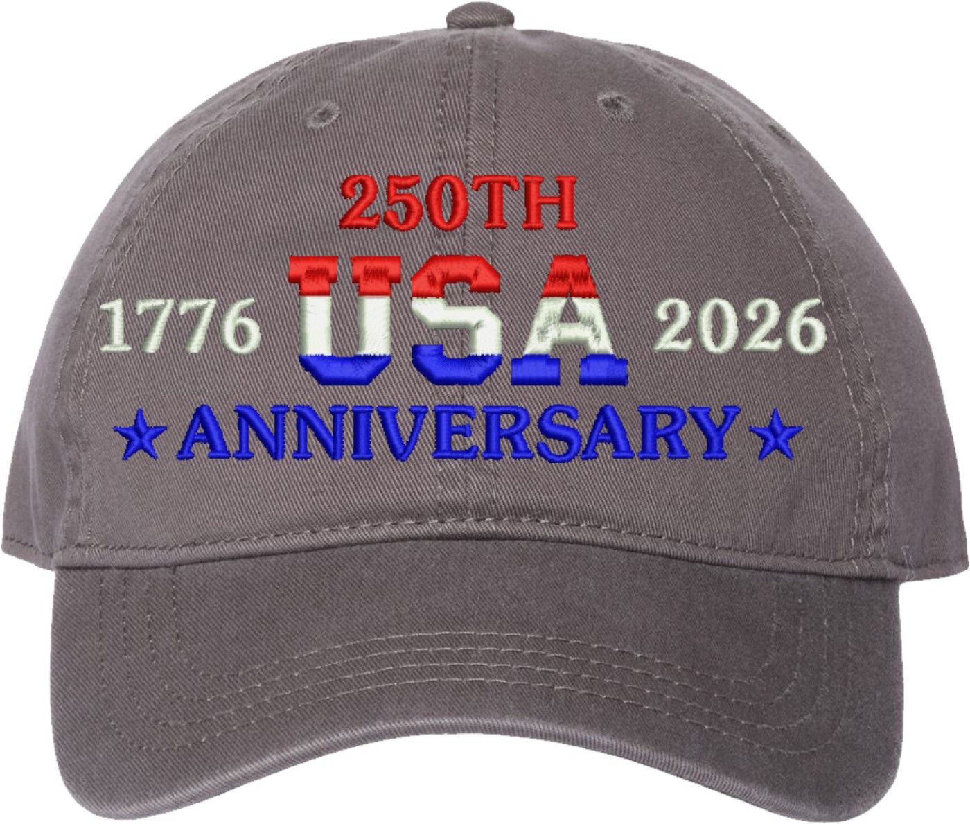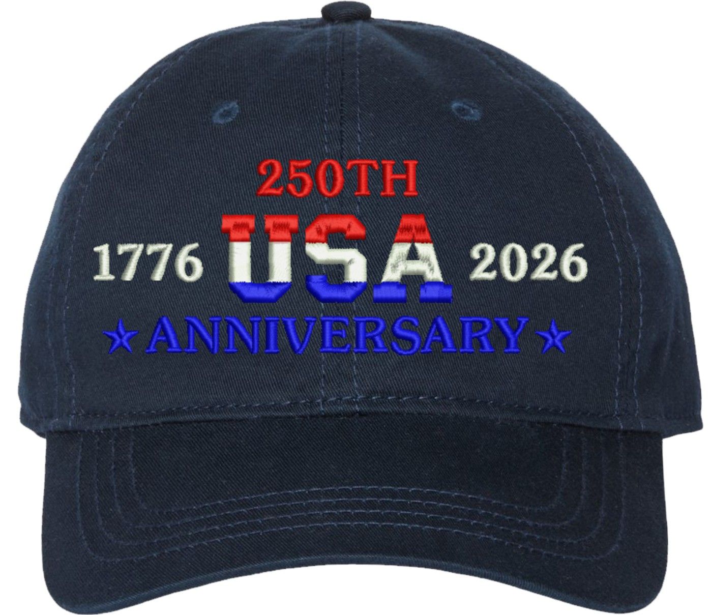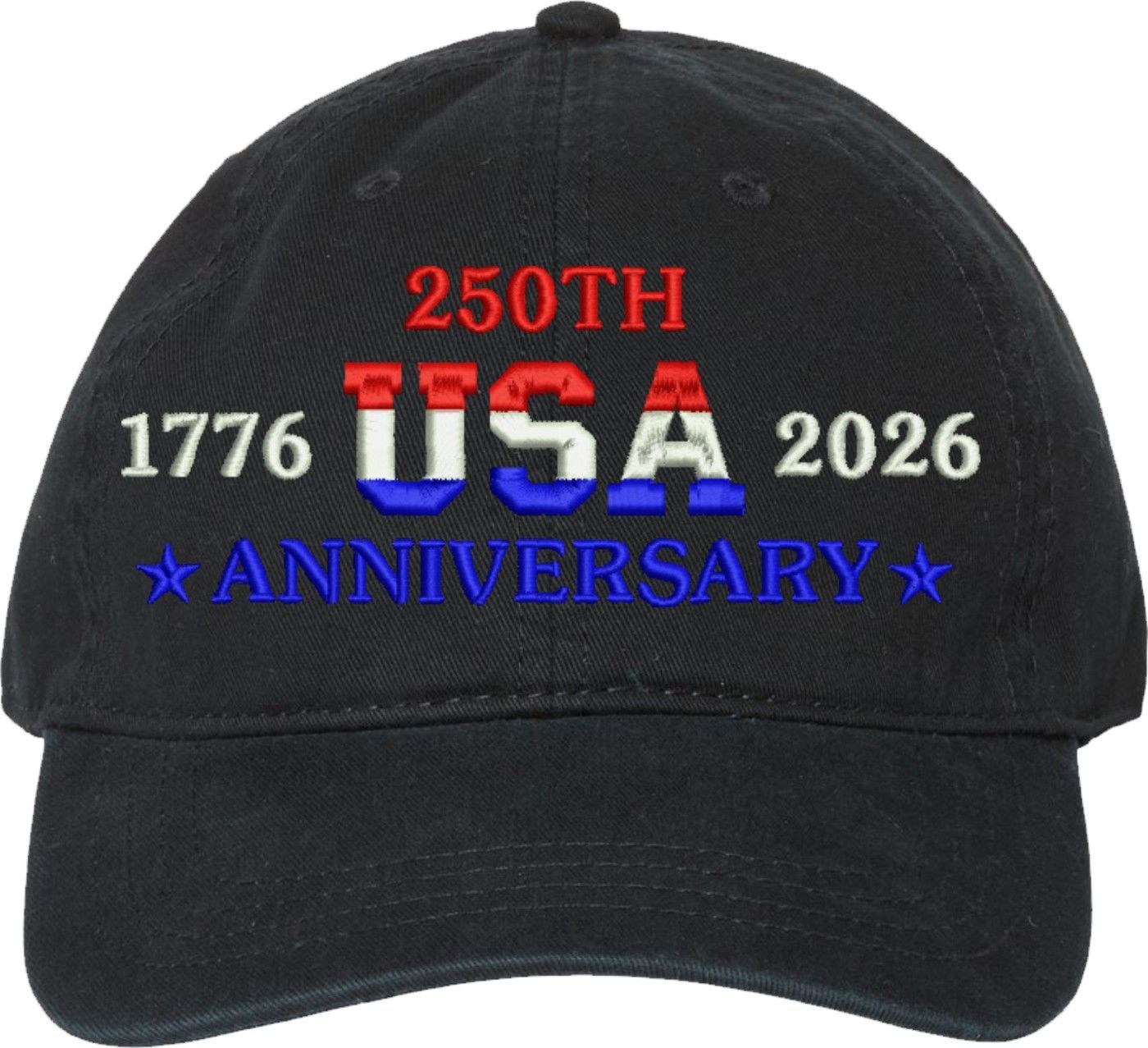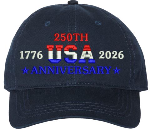 Celebrate 250 years of the United States of America! Show your pride with this 250th USA Anniversary Unstructured Dad Cap from MilitaryBest. Crafted from 100% washed chino twill cotton, this six-panel, low-profile cap offers a relaxed and comfortable fit. Featuring high-quality embroidery done in our Scottsboro, Alabama facility, this cap is designed with a pre-curved visor and an adjustable tri-glide buckle closure for a perfect fit. Whether for everyday wear or as a meaningful gift, this cap is a great way to honor your own or a loved one's service.For caps ordered with custom embroidered personalized text please allow an additional 3 to 5 days production time. All custom back text will be embroidered in ALL CAPITAL LETTERS. Caps with back text or eggs are non-returnable unless there is a material defect in the cap.