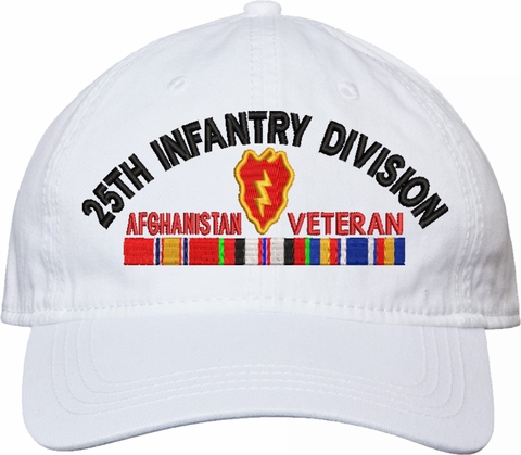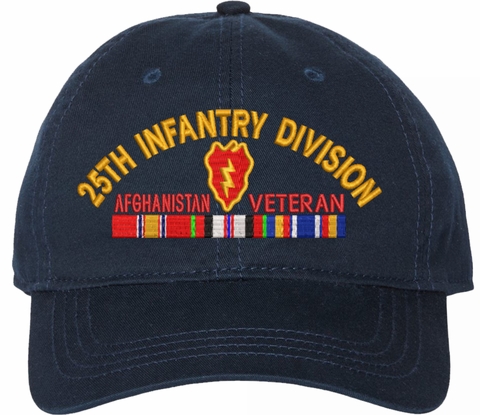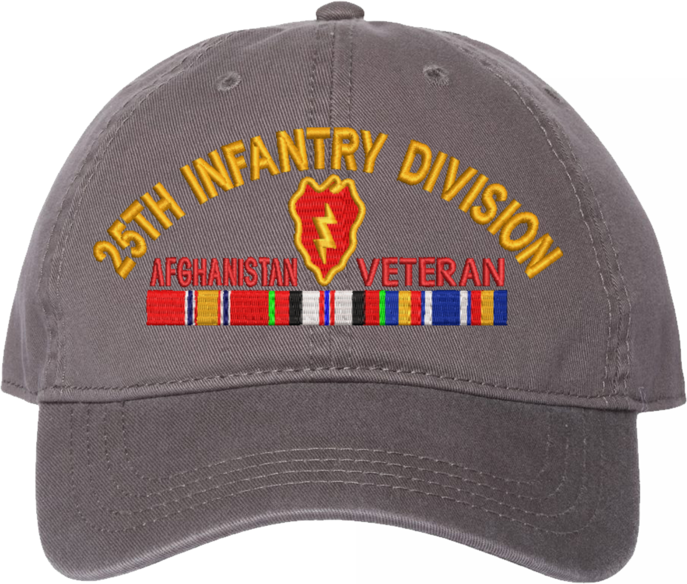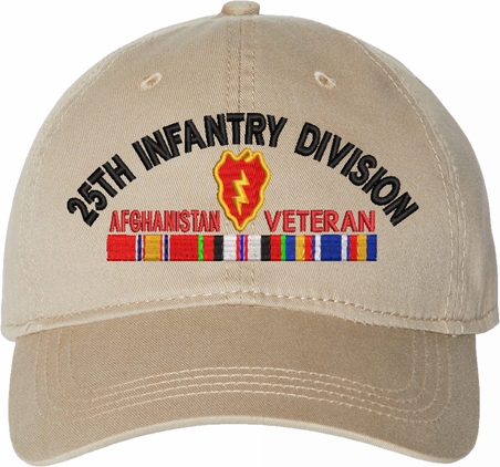 Show your Army pride with this 25th Infantry Division Afghanistan Veteran with Ribbons Unstructured Dad Cap from MilitaryBest. Crafted from 100% washed chino twill cotton, this six-panel, low-profile cap offers a relaxed and comfortable fit. Featuring high-quality embroidery done in our Scottsboro, Alabama facility, this cap is designed with a pre-curved visor and an adjustable tri-glide buckle closure for a perfect fit. Whether for everyday wear or as a meaningful gift, this cap is a great way to honor your own or a loved one's service.For caps ordered with custom embroidered personalized text please allow an additional 3 to 5 days production time. All custom back text will be embroidered in ALL CAPITAL LETTERS. Caps with back text or eggs are non-returnable unless there is a material defect in the cap.