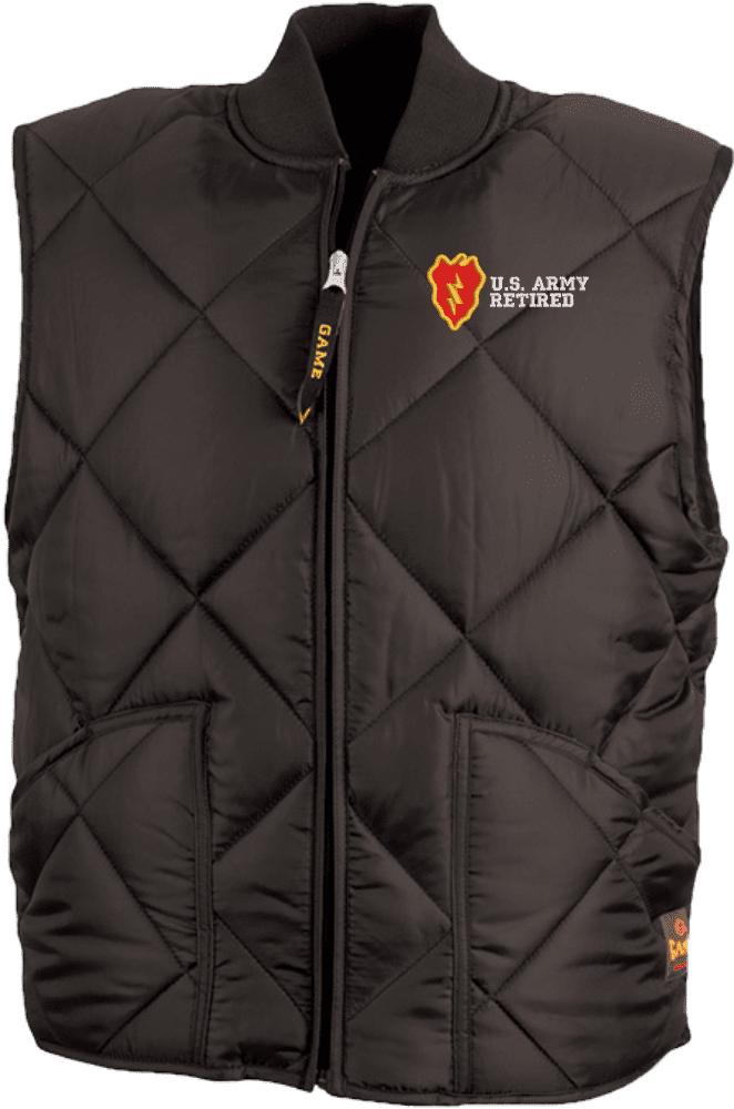 MilitaryBest is proud to offer this quality 25th Infantry Division Retired Game Sportswear Finest Vest. Our U.S. Army Vests feature, wind-resistant nylon taffeta shell, 5oz poly-fill lining with thermal knit backing, full front zipper, 2 outer pockets, and are machine washable. These Military Sportswear Vests are proudly embroidered at our facilities in Scottsboro, AL.