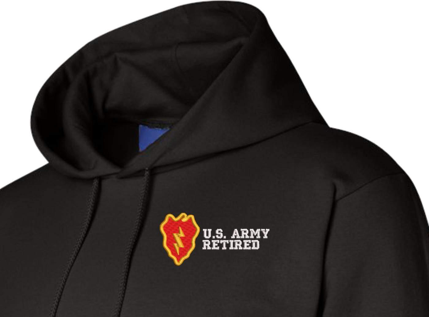 MilitaryBest is proud to offer this quality 25th Infantry Division Retired Hoodie. Each U.S. Army Hoodie is direct embroidered onto either a Champion or Gildan brand Hoodie using a 9.5 oz 50/50 Cotton Poly blend material. These Military Hoodies are proudly embroidered at our facilities in Scottsboro, AL.