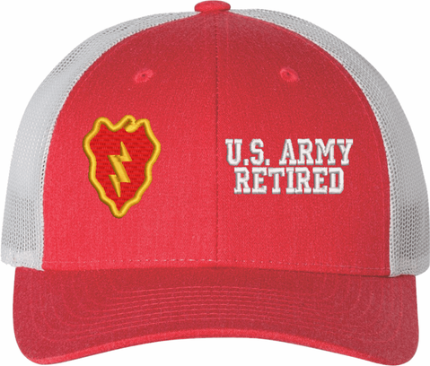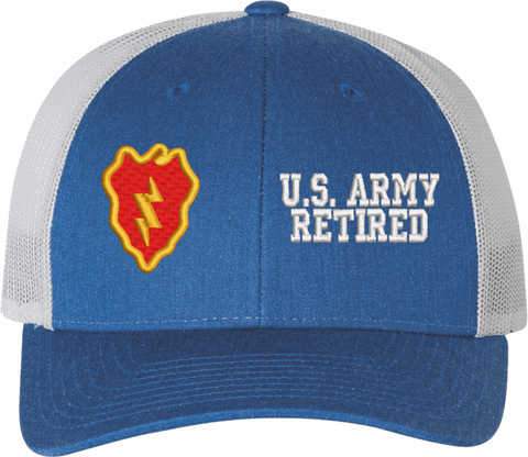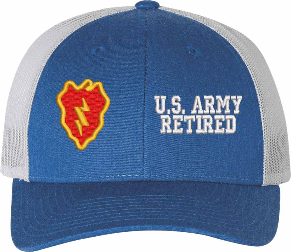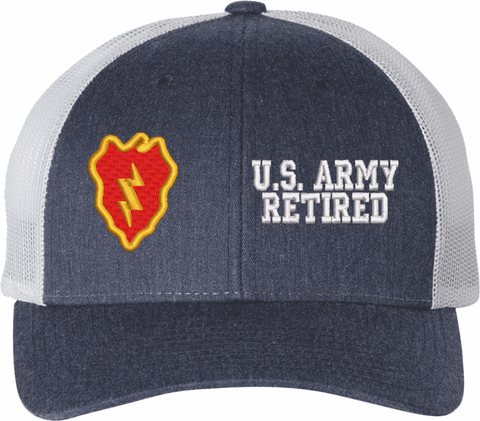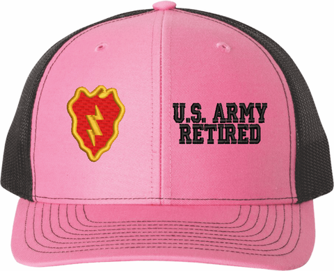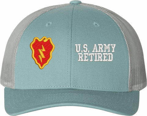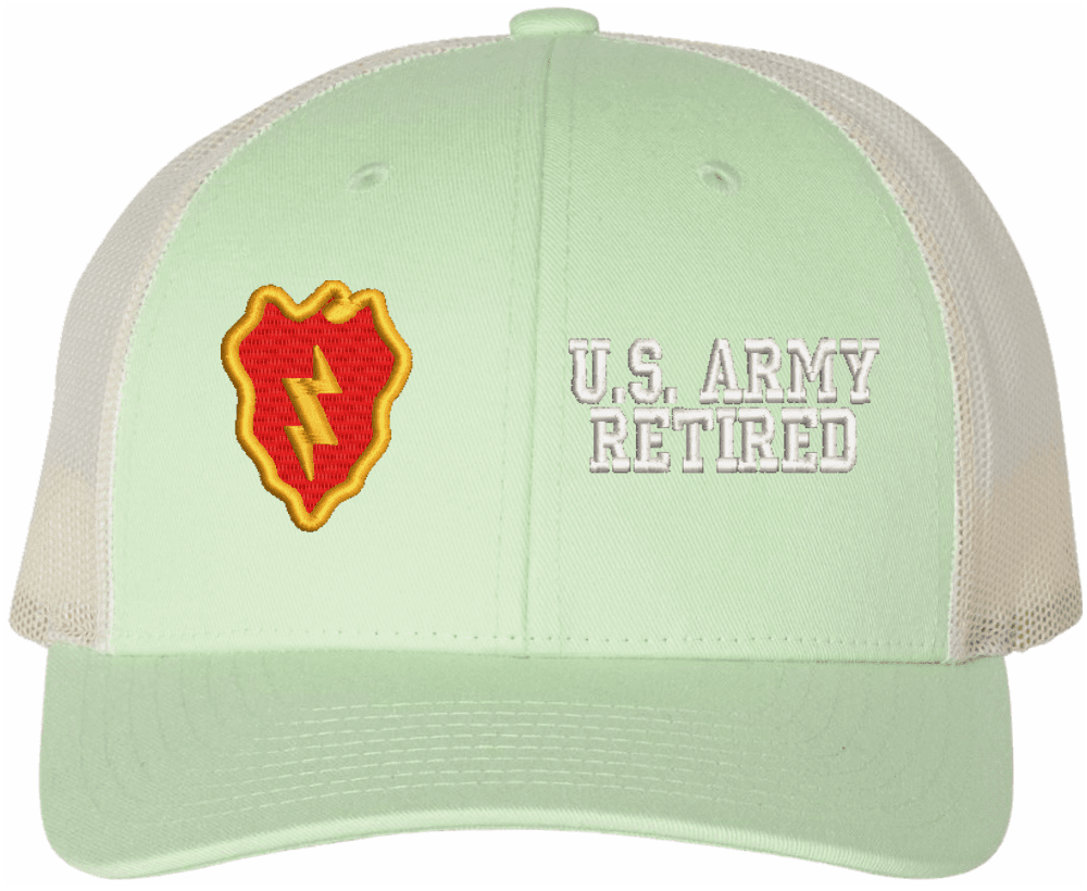 MilitaryBest is proud to offer this Mesh Back U.S. Army 25th Infantry Division Retired Women's Split-Cap. The design is embroidered onto a 6x panel mid/low profile mesh back cap and is crisp, clean, and sure to be loved by all! As with all MilitaryBest caps and apparel your satisfaction is guaranteed!Caps ordered with embroidered back text requires an additional 1 to 2 days of production time. All personalized caps will be embroidered in ALL CAPITAL LETTERS. Caps personalized with back text are not returnable unless there is a material defect in the cap.
