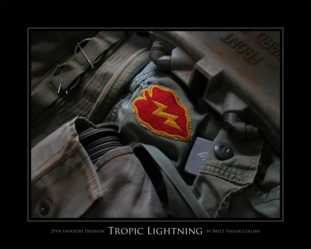 This particular piece was photographed by Britt Taylor Collins with 25th infantry shoulder patch, and a cigarette lighter lent by MG David Bockel who served with the 25th in CHU CHI, and the Former CG of the 90th Regional Support Command, N. Little Rock, AR.