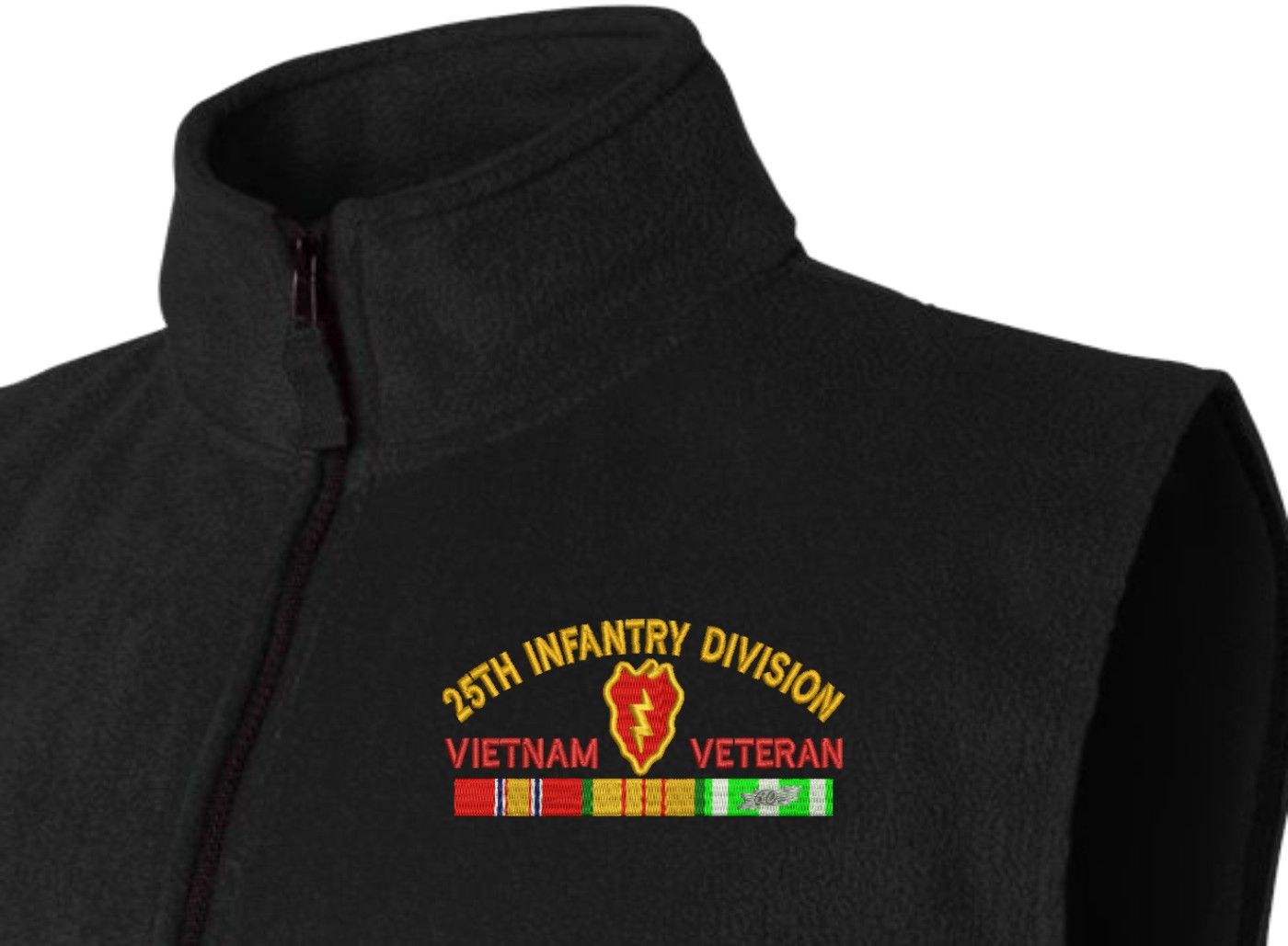 Note: Due to supply chain disruptions, some colors and sizes may not be available in the same brand, in these cases a brand of comarable quality will be used. Feel free to call in advance of your order, with questions you may have.MilitaryBest is proud to offer this quality U.S. Army 25th Infantry Division Vietnam Veteran with Ribbons Embroidered Fleece Vest. This Fleece Vest features a convertible collar with dyed-to-match zipper pull, oversized nylon reinforced slash pockets, and an elastic hem. It is made using a 100% anti-pill polyester Fleece Vest. This Fleece Vest will make an excellent addition to your wardrobe, or a quality gift. Your satisfaction is guaranteed! These quality fleece vests are proudly embroidered at our facilities in Scottsboro, AL. Support the Army MWR program by purchasing only from Licensed Vendors. To all of our Vietnam Veterans, Welcome Home!
