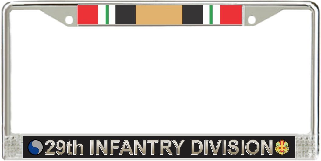 29th Infantry Division Iraq Veteran Service Ribbon License Plate FrameThis U.S. Army 29th Infantry Division Iraq Veteran License Plate Frame is made from the highest quality finished metal alloy. Each one is designed to provide years of use. Each is designed and produced in our facility in Scottsboro, Alabama.
