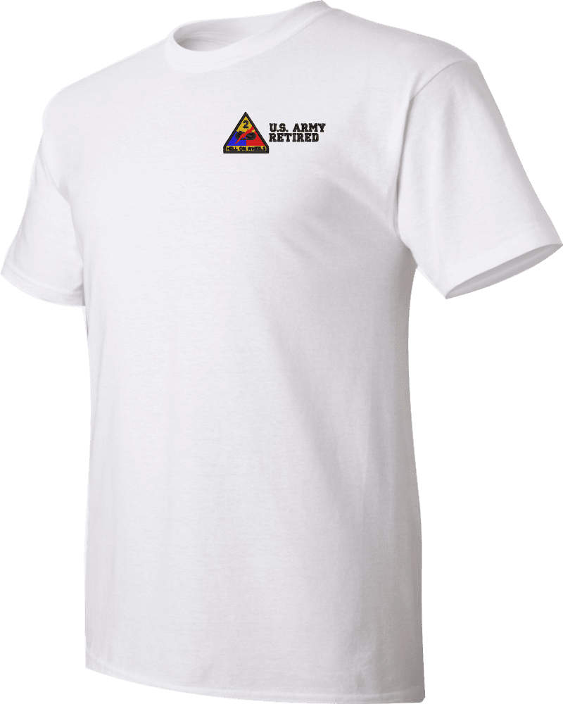 Note: Some of the Color Options pictured may not be available. Available Color Options are listed on the drop down menu above.MilitaryBest is proud to offer this quality 2nd Armored Division Retired T Shirt. This Gildan brand short sleeve t-shirt is made using a 6 oz pre-shrunk 100% cotton material. These quality Military T Shirts are proudly embroidered at our facilities in Scottsboro, AL. Support the Army MWR program by purchasing only from Licensed Vendors.