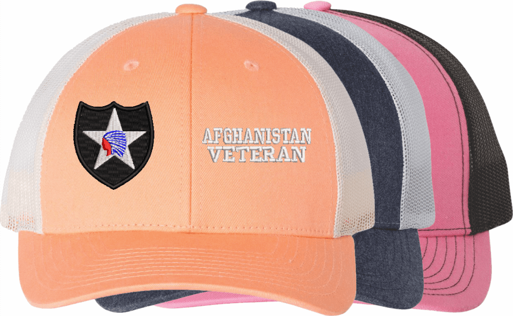 MilitaryBest is proud to offer this Mesh Back U.S. Army 2nd Infantry Division Afghanistan Veteran Women's Split-Cap. The design is embroidered onto a 6x panel mid/low profile mesh back cap and is crisp, clean, and sure to be loved by all! As with all MilitaryBest caps and apparel your satisfaction is guaranteed!Caps ordered with embroidered back text requires an additional 1 to 2 days of production time. All personalized caps will be embroidered in ALL CAPITAL LETTERS. Caps personalized with back text are not returnable unless there is a material defect in the cap.