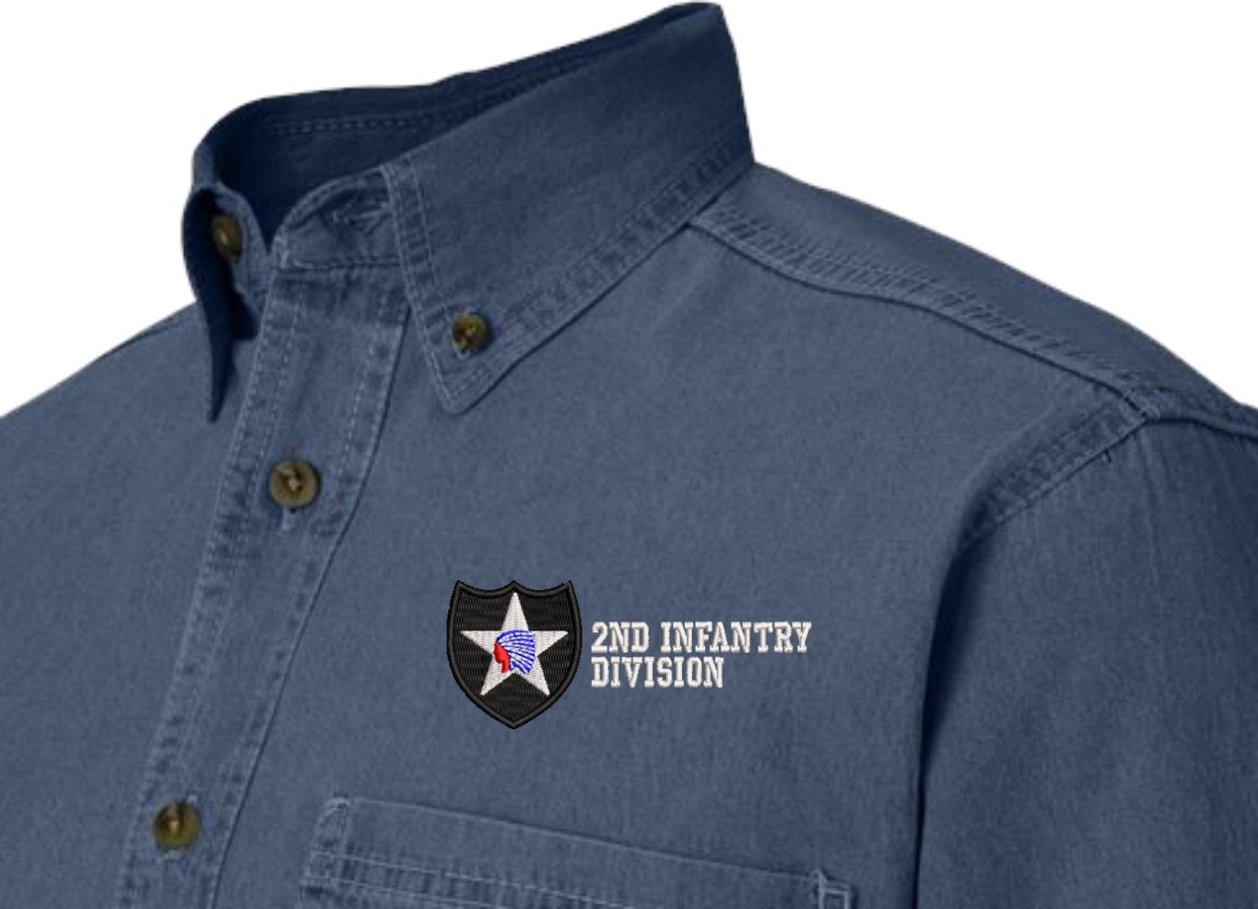 Note: Some of the Color Options pictured may not be available. Available Color Options are listed on the drop down menu above.MilitaryBest is proud to offer this quality 2nd Infantry Division Denim Shirt. This long sleeve button down denim shirt is made using a 100% cotton denim material. These quality Military Denim Shirts are proudly embroidered at our facilities in Scottsboro, AL. Support the Army MWR program by purchasing only from Licensed Vendors.