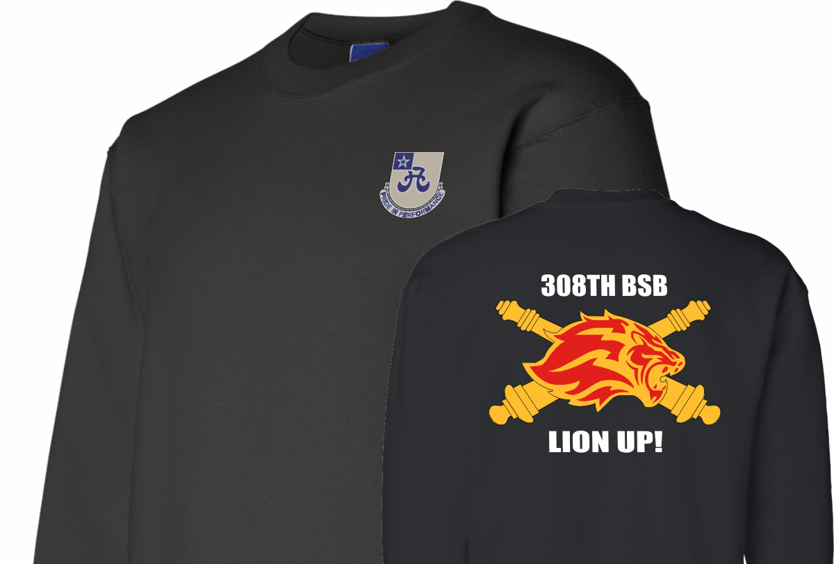 MilitaryBest is proud to offer this fine 308th Brigade Support Battalion Sweatshirt. The 308th crest is printed on the front left chest and the Lion Up Unit Insignia is offered as an option the back of the sweatshirt.design. Each 308th Sweatshirt is proudly printed in the USA.Unless there is a defect in workmanship or material, these shirts are unreturnable.