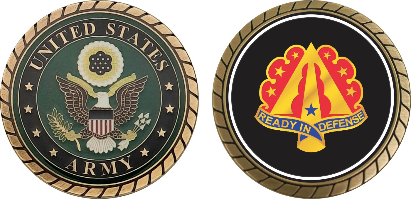 This 1 3/4” 35th Air Defense Artillery Brigade Unit Crest Challenge Coin is proudly offered by Militarybest. This Officially Licensed Army coin has beautiful enamel finish on one side and an organized crisp clean design on the opposite side.