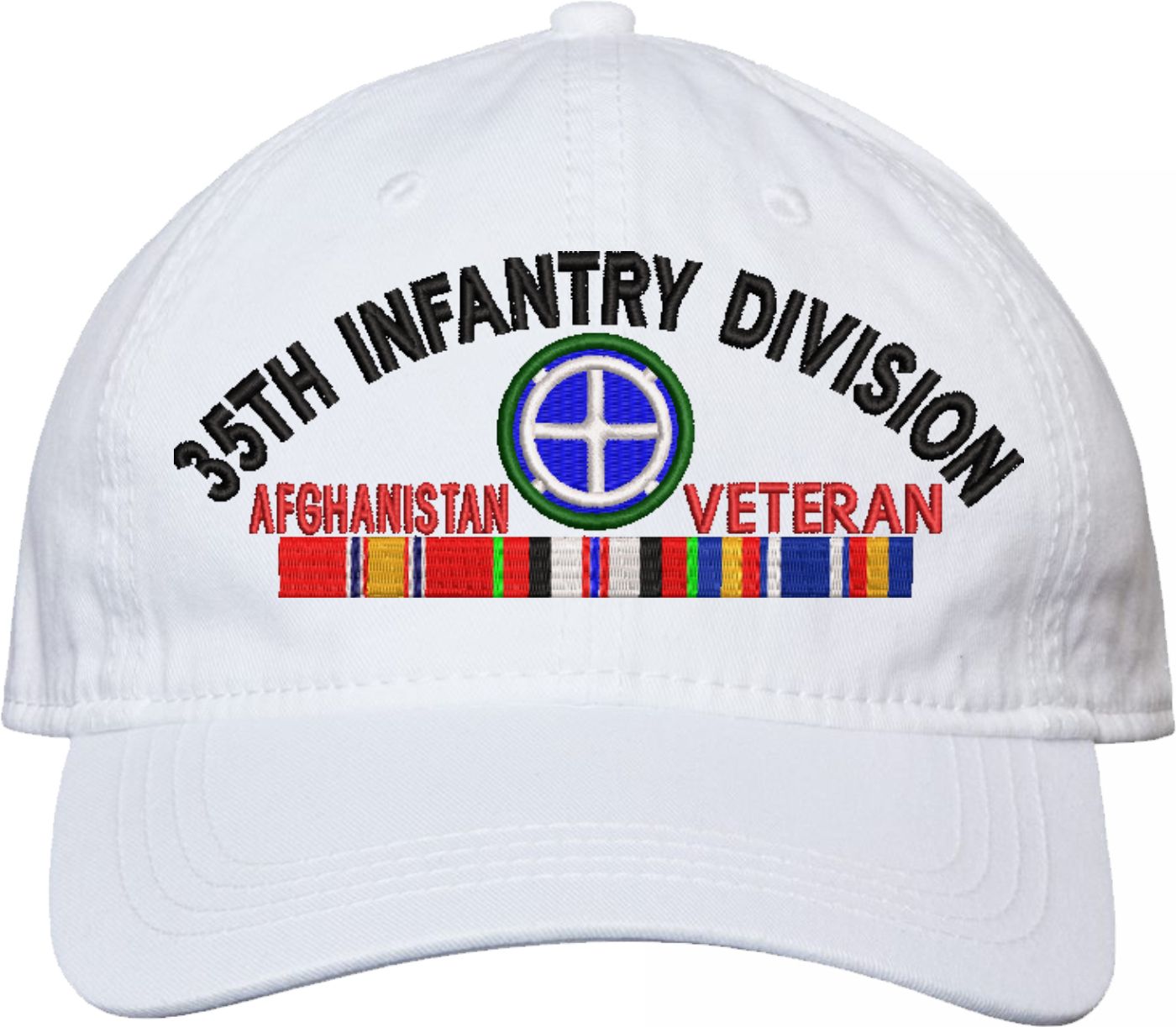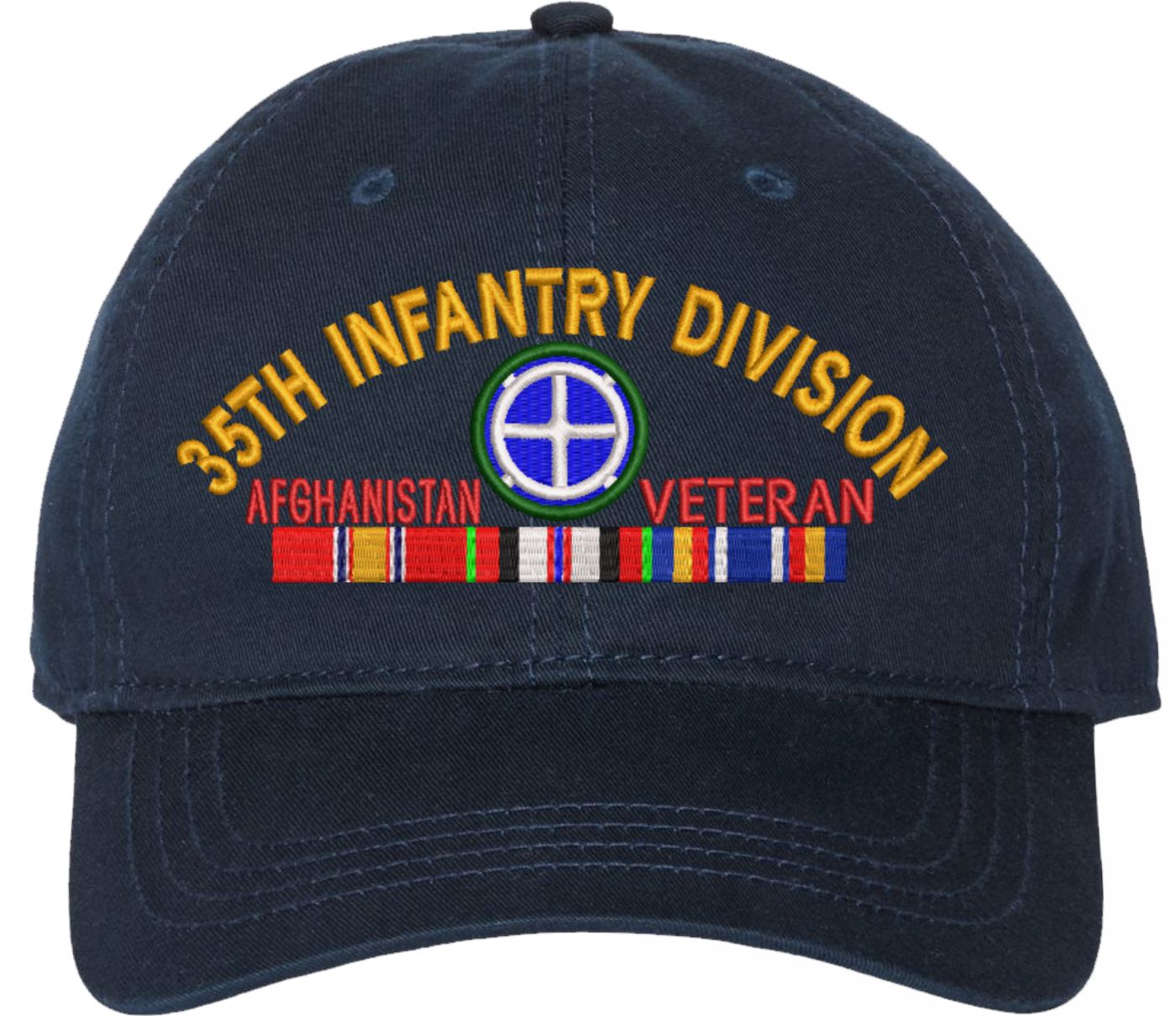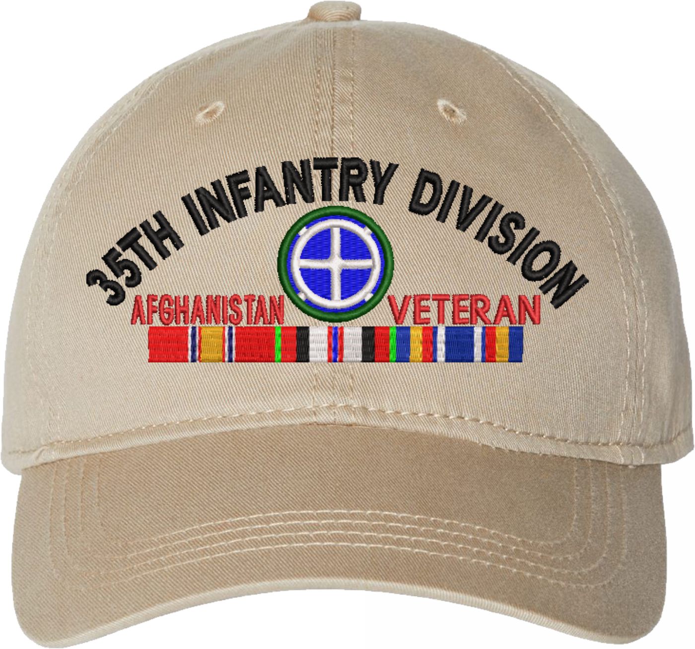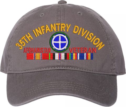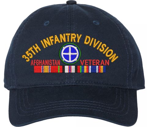 Show your Army pride with this 35th Infantry Division Afghanistan Veteran with Ribbons Unstructured Dad Cap from MilitaryBest. Crafted from 100% washed chino twill cotton, this six-panel, low-profile cap offers a relaxed and comfortable fit. Featuring high-quality embroidery done in our Scottsboro, Alabama facility, this cap is designed with a pre-curved visor and an adjustable tri-glide buckle closure for a perfect fit. Whether for everyday wear or as a meaningful gift, this cap is a great way to honor your own or a loved one's service.For caps ordered with custom embroidered personalized text please allow an additional 3 to 5 days production time. All custom back text will be embroidered in ALL CAPITAL LETTERS. Caps with back text or eggs are non-returnable unless there is a material defect in the cap.