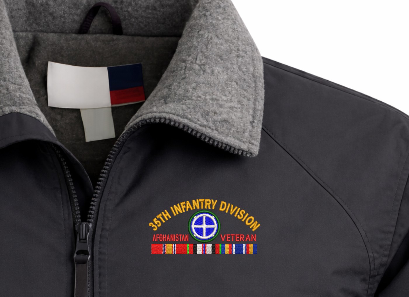 Note: Some of the Color Options pictured may not be available. Available Color Options are listed on the drop down menu above.MilitaryBest is proud to offer this quality U.S. Army 35th Infantry Division Afghanistan Veteran with Ribbons Embroidered 3-Season Jacket. This 3-Season Jacket is made from a 3-Layer system consisting of a nylon shell, an insulator layer, Nylon-lined sleeves, and an inside layer of fleece for comfort. The jacket features include a sturdy black enamel front-zipper, raglan sleeves, outsize zip pockets, an inside zip security pocket, YKK zippers, and a banded-bottom. This Jacket will make an excellent addition to your wardrobe, or a quality gift. Your satisfaction is guaranteed! Depending on your location this jacket can be worn in fall, winter, and spring. These quality Military Jackets are proudly embroidered at our facilities in Scottsboro, AL. Support the Army MWR program by purchasing only from Licensed Vendors.