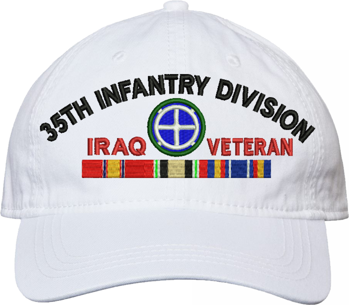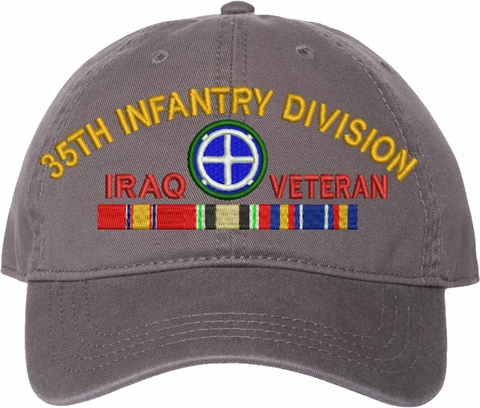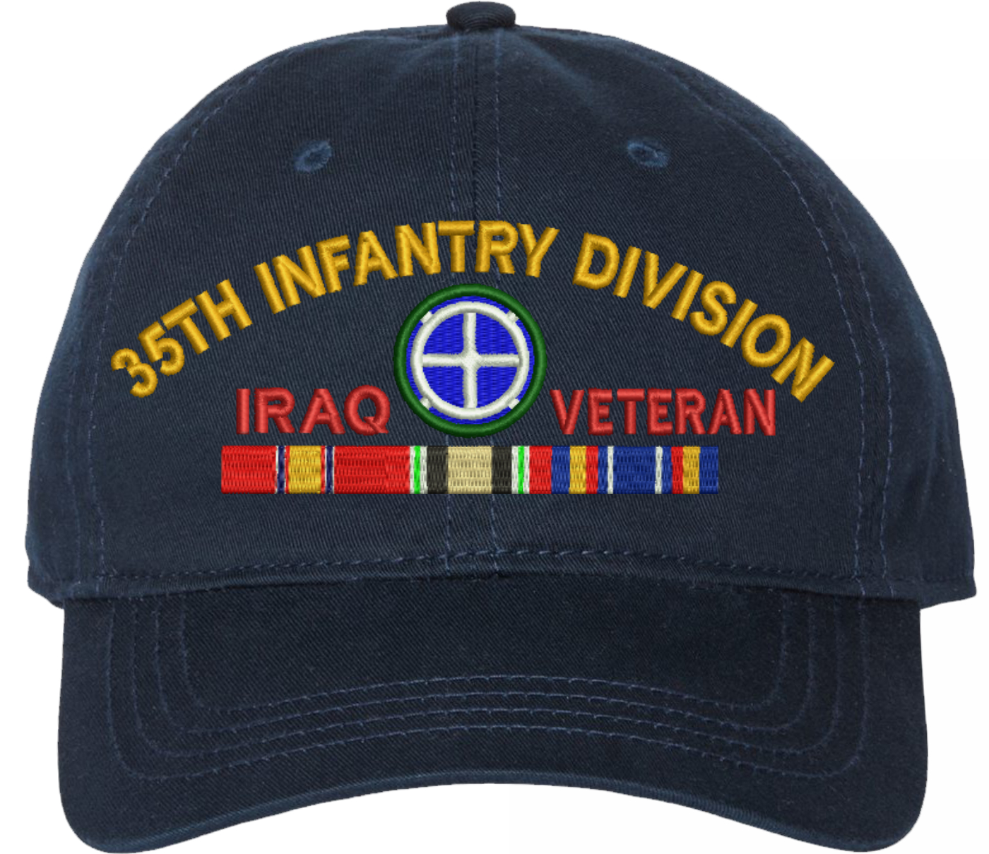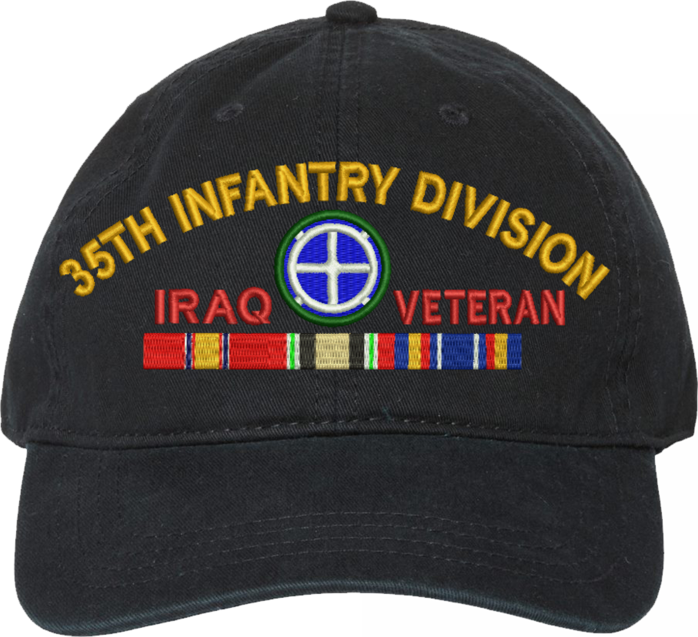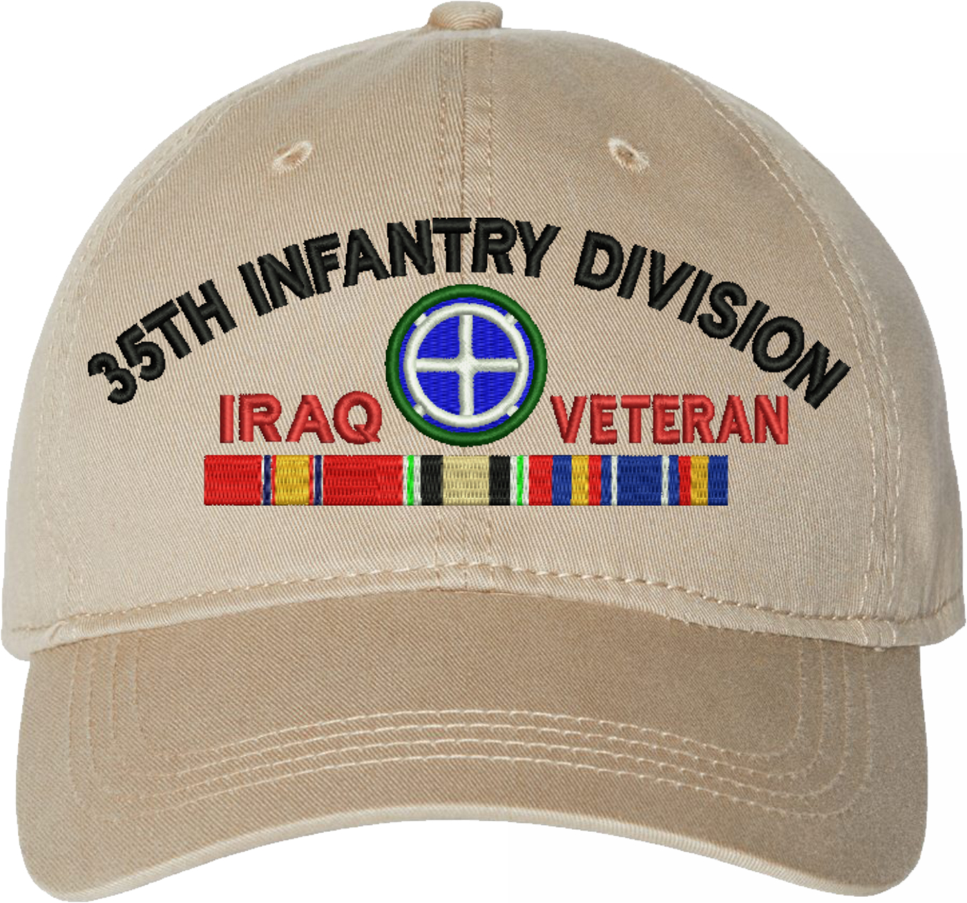 Show your Army pride with this 35th Infantry Division Iraq Veteran with Ribbons Unstructured Dad Cap from MilitaryBest. Crafted from 100% washed chino twill cotton, this six-panel, low-profile cap offers a relaxed and comfortable fit. Featuring high-quality embroidery done in our Scottsboro, Alabama facility, this cap is designed with a pre-curved visor and an adjustable tri-glide buckle closure for a perfect fit. Whether for everyday wear or as a meaningful gift, this cap is a great way to honor your own or a loved one's service.For caps ordered with custom embroidered personalized text please allow an additional 3 to 5 days production time. All custom back text will be embroidered in ALL CAPITAL LETTERS. Caps with back text or eggs are non-returnable unless there is a material defect in the cap.