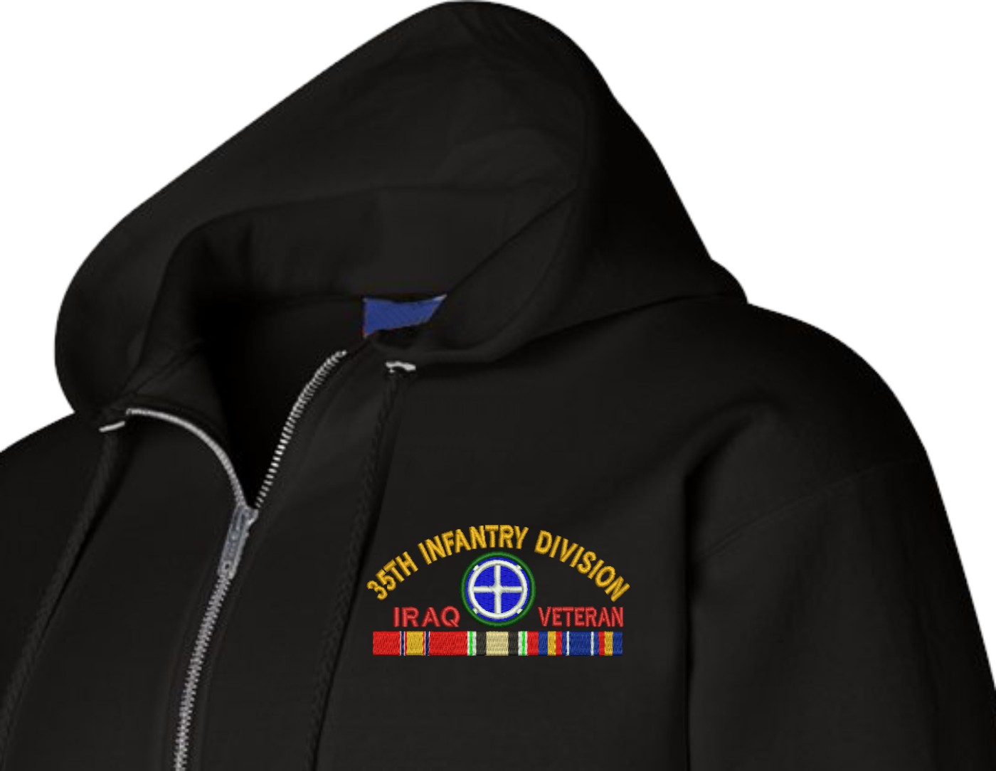 MilitaryBest has expanded its line of apparel with this custom embroidered U.S. Army 35th Infantry Division Iraq Veteran with Ribbons Embroidered Zippered Hoodie. Each Hoodie is direct embroidered onto a Champion brand 9.5 oz 50/50 Cotton Poly blend. This will make an excellent addition to your wardrobe, or a great gift. Your satisfaction is Guaranteed! These quality zippered hoodies are proudly embroidered at our facilities in Scottsboro, AL. Support the Army MWR program by purchasing only from Licensed Vendors.