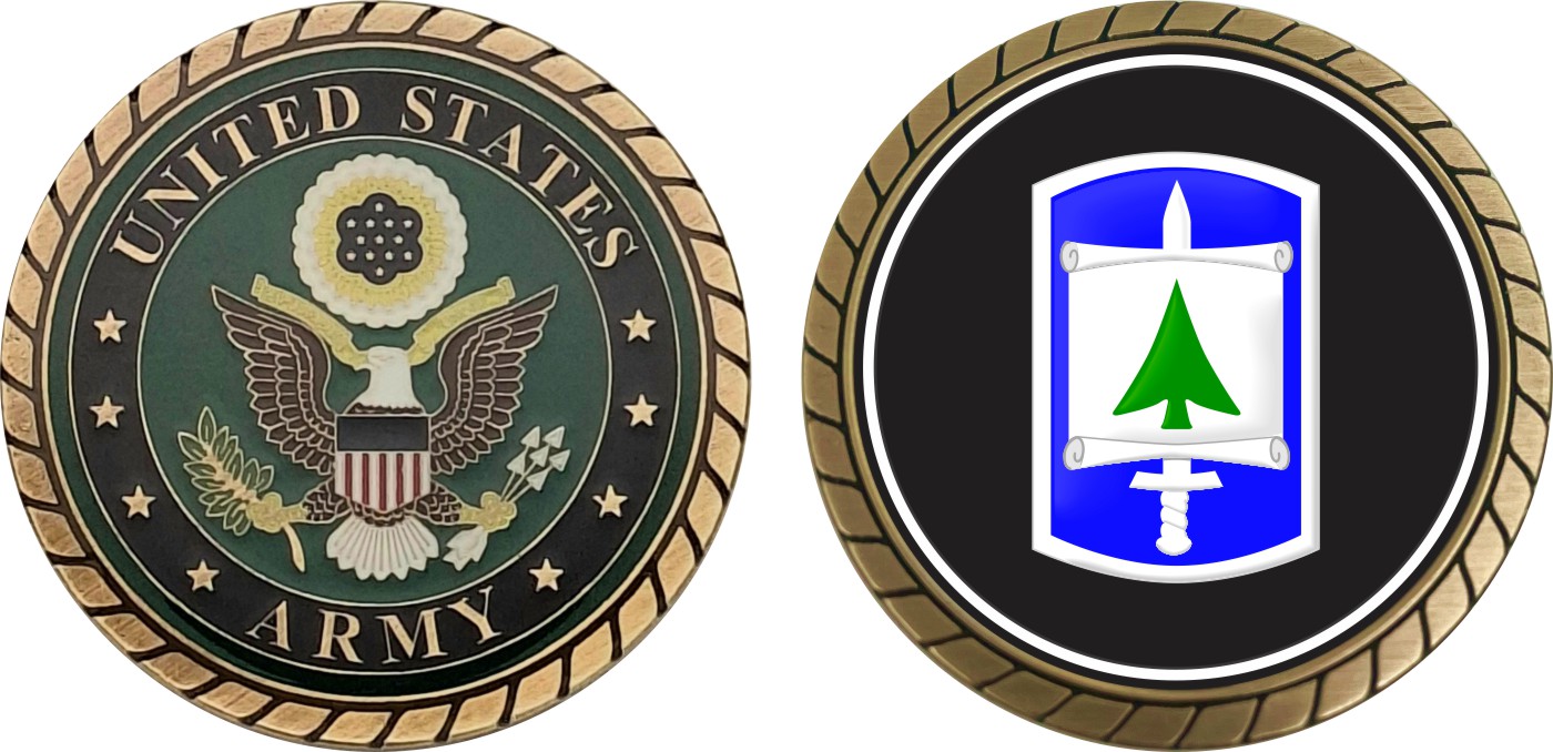 This 1 3/4” 364th Civil Affairs Brigade Patch Challenge Coin is proudly offered by Militarybest. This Officially Licensed Army coin has beautiful enamel finish on one side and an organized crisp clean design on the opposite side.