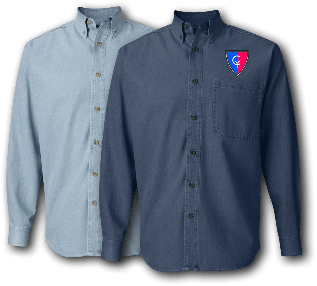 Each 38th Infantry Division Denim shirt is made of 6.5 oz., 100% cotton denim, Button-down collar with woodtone buttons, Three woodtone buttons on adjustable placket cuff, Double-needle STITCHING throughout, felled seams, Left chest pocket, Two-ply back yoke and locker loop, and a seamless body with set-in sleeves. Enjoy your shirt!