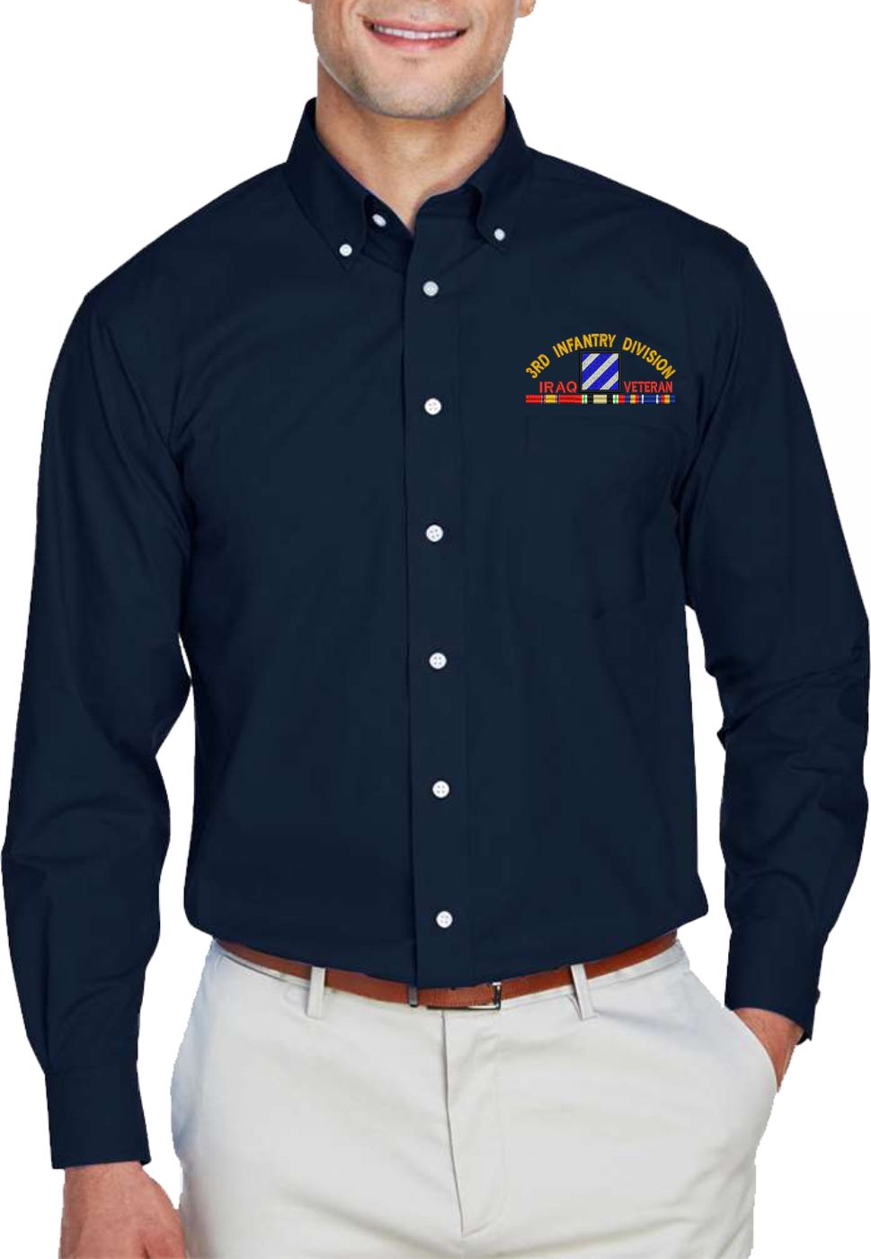 MilitaryBest has expanded its line of apparel with this 3rd Infantry Division Iraq Veteran with Ribbons Embroidered Dress Shirt. This long sleeve button down dress shirt is made using a stain-release, wrinkle-free, 55% cotton/45% polyester material. The pocket over the left chest measures 4 3/4" across. Featuring a 3rd Infantry Division Iraq Veteran with Ribbons design above the pocket, this shirt is embroidered to order at our facilities in Scottsboro, AL..- 55% cotton/45% polyester