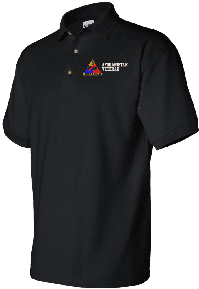 Note: Some of the Color Options pictured may not be available. Available Color Options are listed on the drop down menu above.MilitaryBest is proud to offer this quality 3rd Armored Division Afghanistan Veteran Polo. Each Polo is available in either 100% Ringspun cotton pique or a 50/50 cotton/polyester blend. These quality Military Polos are proudly embroidered at our facilities in Scottsboro, AL. Support the Army MWR program by purchasing only from Licensed Vendors.