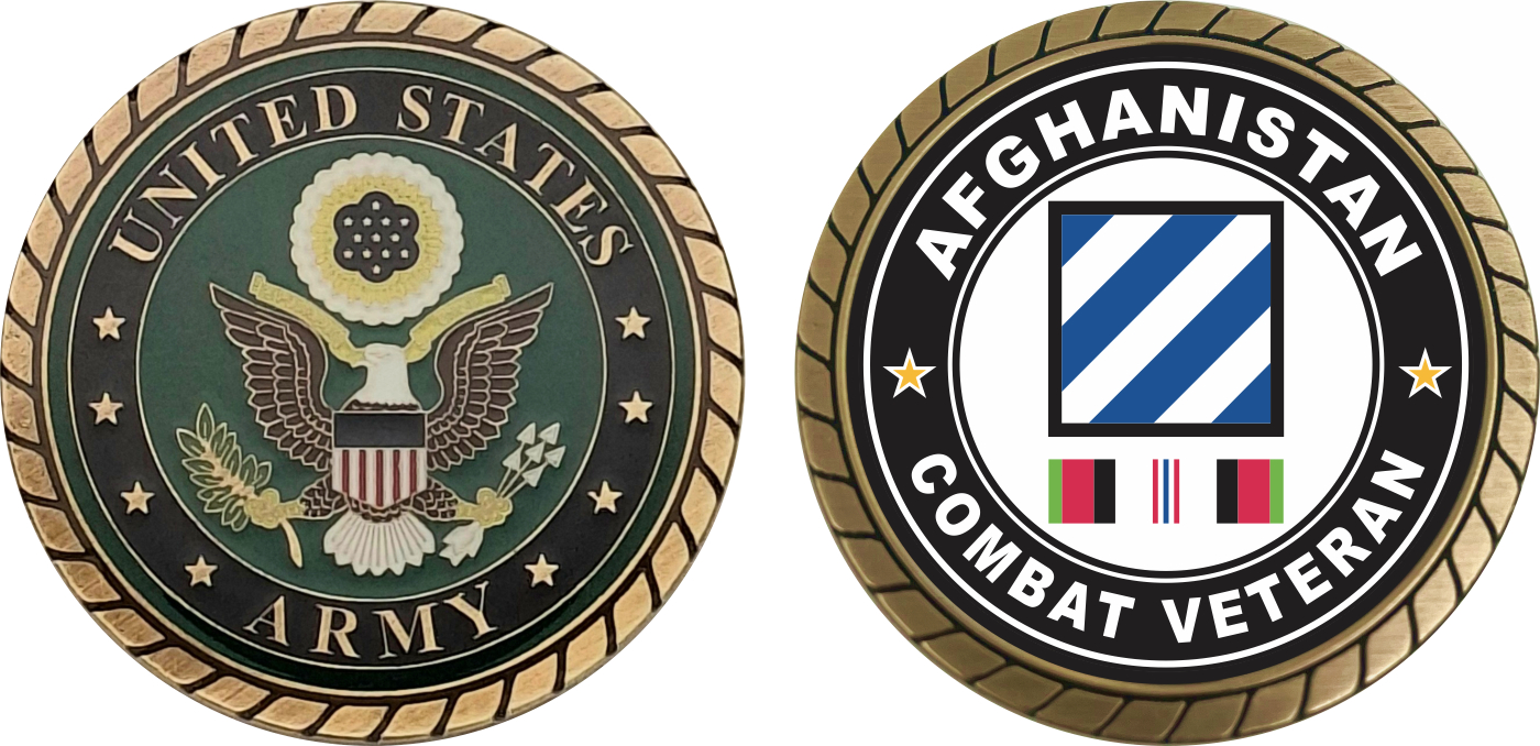 This 1 3/4” 3rd Infantry Division Afghanistan Combat Veteran Challenge Coin is proudly offered by MilitaryBest. This Officially Licensed Army coin has beautiful enamel finish on one side and an organized crisp clean 3rd Infantry Division Afghanistan Combat Veteran design on the opposite side.