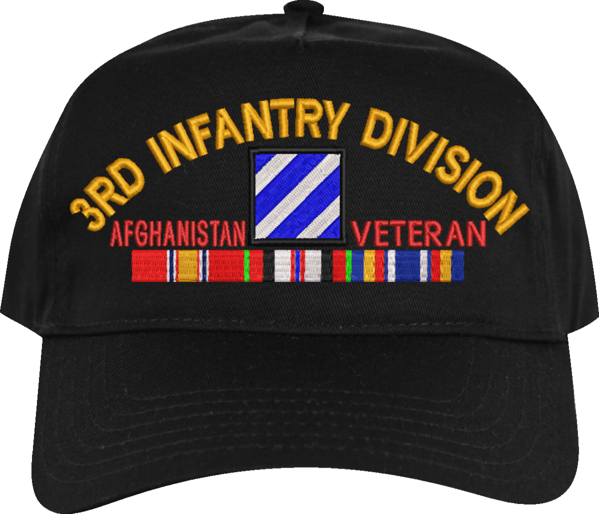 MilitaryBest is proud to offer this 3rd Infantry Division Afghanistan Veteran Embroidered Cap with Ribbons. This cap is available in a 5 panel high profile or 6 panel low profile styling. All our caps are made from top quality materials. This cap would make a wonderful addition to your collection or a great gift! All custom embroidery is done at our facility in Scottsboro, AL.