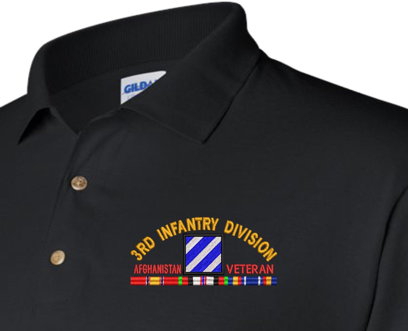 MilitaryBest is proud to offer this quality U.S. Army 3rd Infantry Division Afghanistan Veteran with Ribbons Embroidered Polo. Each Polo is available in either 100% Ringspun cotton pique or a 50/50 cotton/polyester blend. These quality Military Polos are proudly embroidered at our facilities in Scottsboro, AL. Support the Army MWR program by purchasing only from Licensed Vendors.