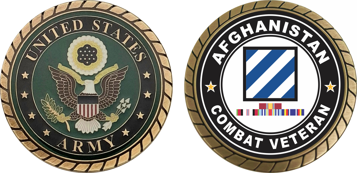 This 1 3/4” 3rd Infantry Division Afghanistan with GWOT Ribbons Combat Veteran Challenge Coin is proudly offered by MilitaryBest. This Officially Licensed Army coin has beautiful enamel finish on one side and an organized crisp clean 3rd Infantry Division Afghanistan with GWOT Ribbons Combat Veteran design on the opposite side.
