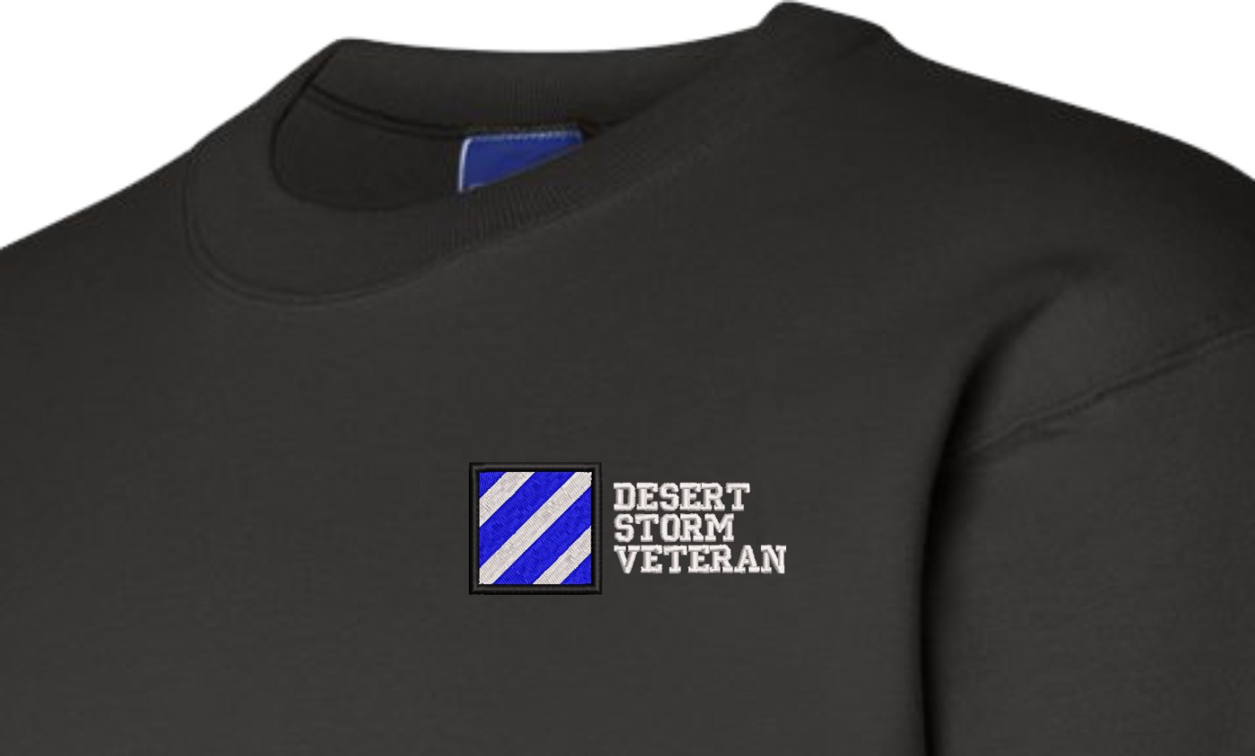 MilitaryBest is proud to offer this quality 3rd Infantry Division Desert Storm Veteran Sweatshirt. Each U.S. Army sweatshirt is direct embroidered onto either a Champion or Jerzees brand sweatshirt using a 9.5 oz 50/50 Cotton Poly blend material. These Military Sweatshirts are proudly embroidered at our facilities in Scottsboro, AL.
