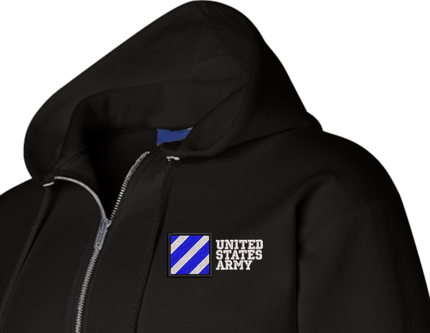MilitaryBest is proud to offer this quality 3rd Infantry Division United States Army Zippered Hoodie. Each U.S. Army Zippered Hoodie is direct embroidered onto either a Champion or Gildan brand Zippered Hoodie using a 9.5 oz 50/50 Cotton Poly blend material. These Military Zippered Hoodies are proudly embroidered at our facilities in Scottsboro, AL.