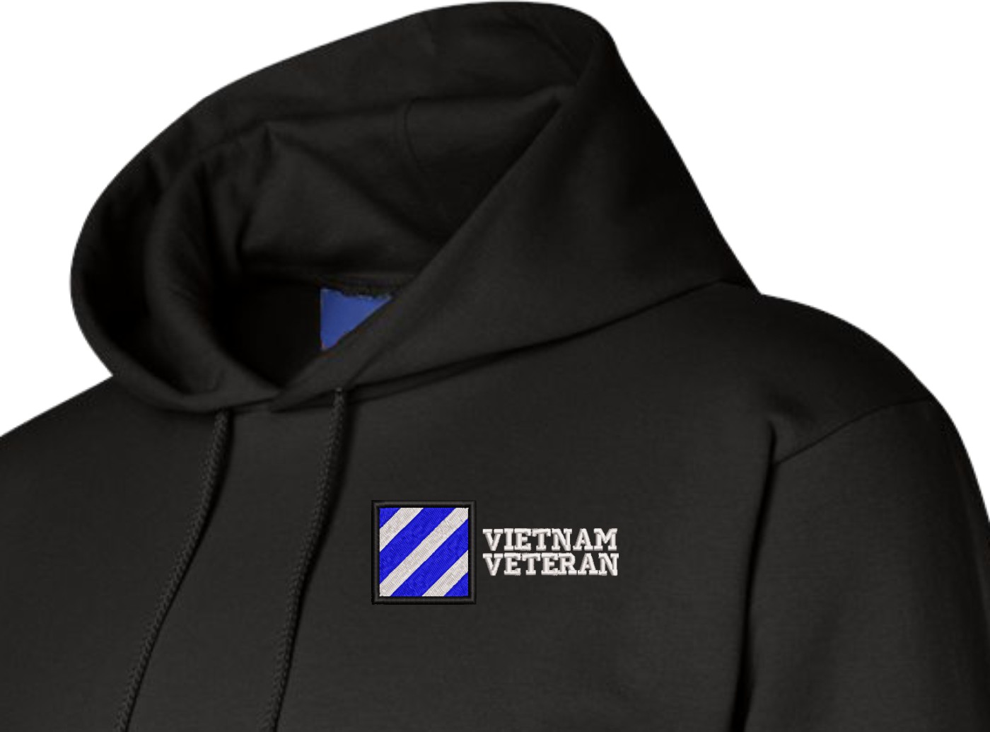 MilitaryBest is proud to offer this quality 3rd Infantry Division Vietnam Veteran Hoodie. Each U.S. Army Hoodie is direct embroidered onto either a Champion or Gildan brand Hoodie using a 9.5 oz 50/50 Cotton Poly blend material. These Military Hoodies are proudly embroidered at our facilities in Scottsboro, AL.