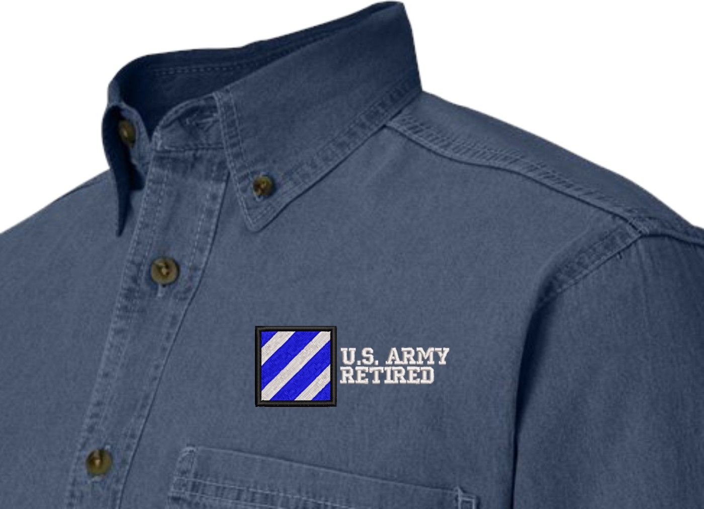 Note: Some of the Color Options pictured may not be available. Available Color Options are listed on the drop down menu above.MilitaryBest is proud to offer this quality 3rd Infantry Division Retired Denim Shirt. This long sleeve button down denim shirt is made using a 100% cotton denim material. These quality Military Denim Shirts are proudly embroidered at our facilities in Scottsboro, AL. Support the Army MWR program by purchasing only from Licensed Vendors.
