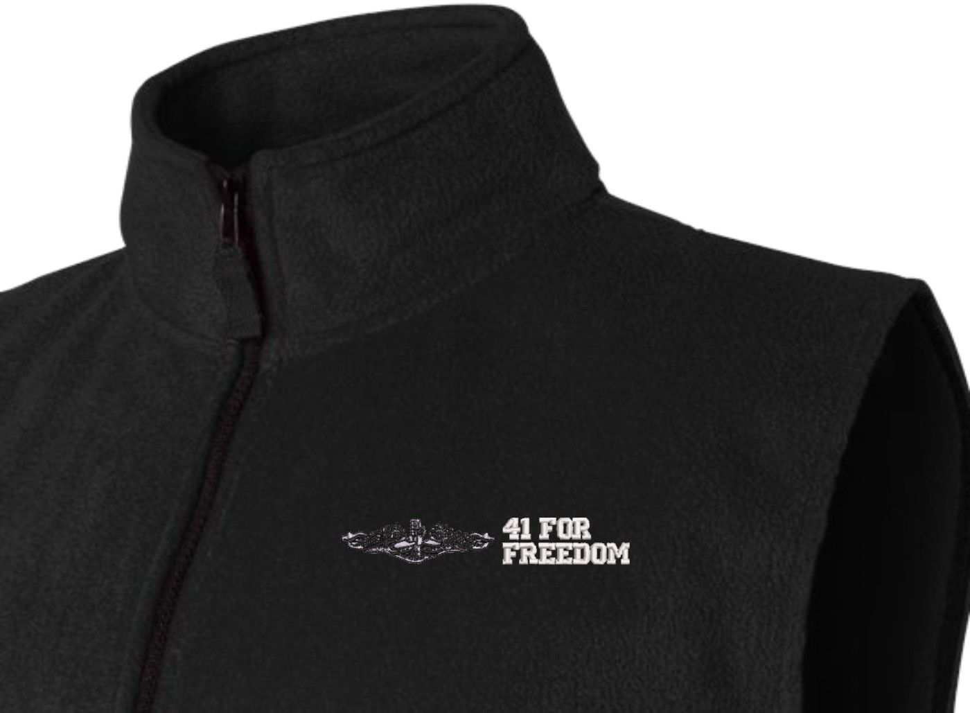 Due to supply chain disruptions, some colors and sizes may not be available in the same Brand, in these cases a brand of comparable quality will be used. Feel free to call in advance of your order, with questions you may have.MilitaryBest is proud to offer this quality U.S. Navy Enlisted Silver Dolphins 41 For Freedom Full Zip Fleece Vest. Our U.S. Navy Full Zip Fleece Vest features a convertible collar with dyed-to-match zipper pull and oversized nylon reinforced slash pockets. These Military Vests are proudly embroidered at our facilities in Scottsboro, AL.