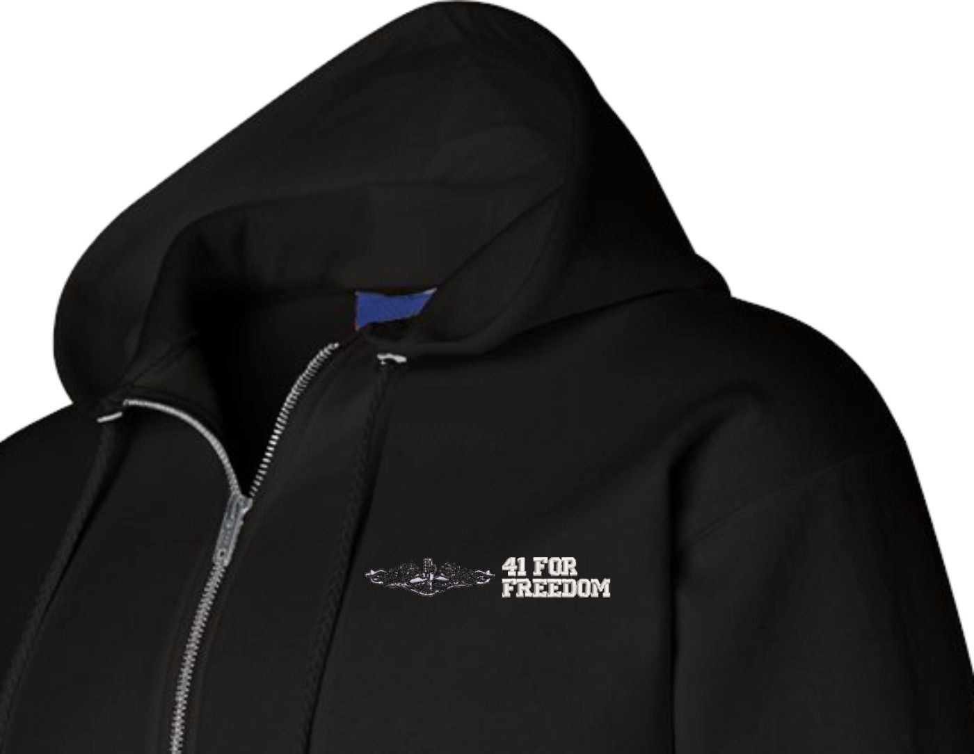 MilitaryBest is proud to offer this quality U.S. Navy Enlisted Silver Dolphins 41 For Freedom Zippered Hoodie. Each U.S. Navy Zippered Hoodie is direct embroidered onto either a Champion or Gildan brand Zippered Hoodie using a 9.5 oz 50/50 Cotton Poly blend material. These Military Zippered Hoodies are proudly embroidered at our facilities in Scottsboro, AL.
